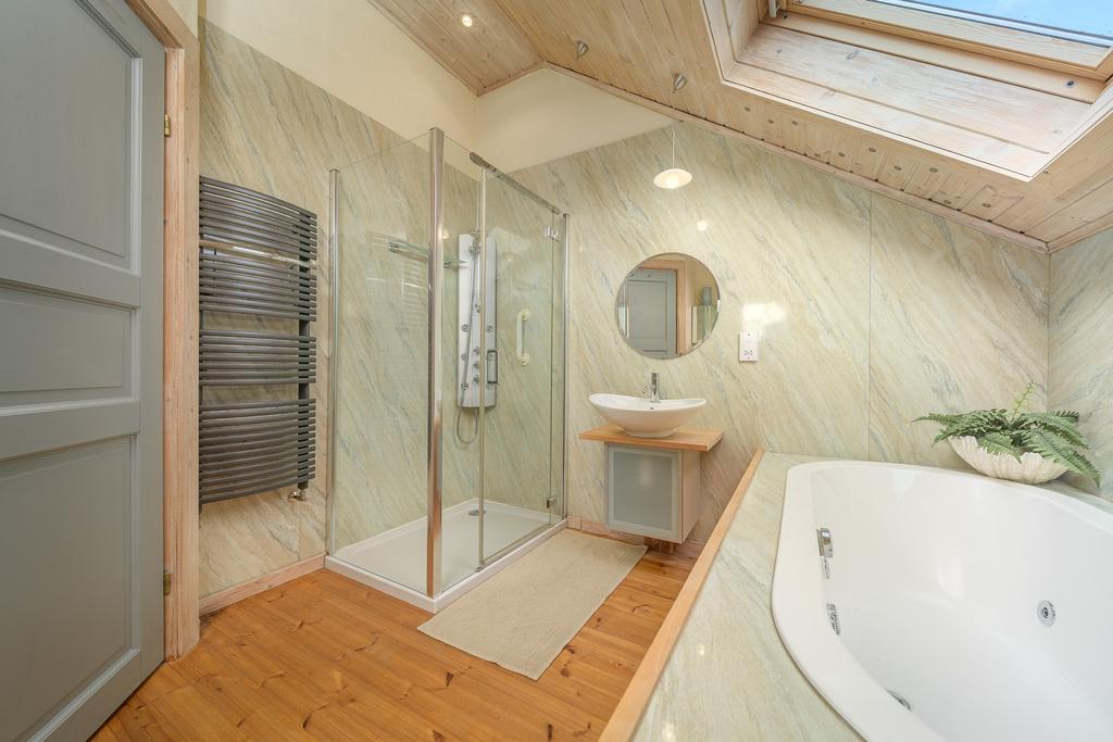 The primary bedroom, with en-suite facilities, is a wonderful super king-sized room which boasts double French doors which open onto a veranda overlooking the front of the property. This is the perfect space in which to relax with a cup of coffee at the beginning of the day. Two further windows to the front allow additional natural light to circulate within this beautiful room which offers a good amount of fitted storage in addition to a central door which opens into a walk-in dressing area. The spacious en-suite comprises a massage shower with jets and a separate shower head within behind a pivot door, a deep and wide bath complete with massage jets, a close coupled toilet with a push button behind, a wall hung vanity unit with an oval hand wash basin on top, a separate storage unit and an anthracite coloured heated towel rail ensures added comfort. A Velux window, and a second window, allows for natural light which illuminates the marble-look wet walling which creates a designer look.