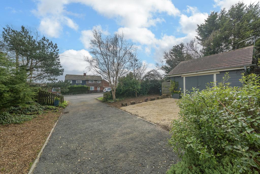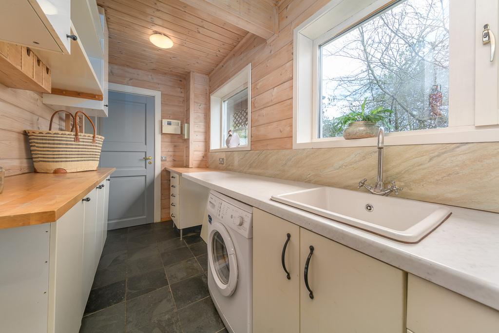 A partially glazed door opens into a useful utility room where there are further base and wall units with a cream-coloured door complemented by a wooden work surface which incorporates a Belfast sink. There is space and plumbing for a washing machine and space for a second under bench appliance. The gas boiler and water cylinder are housed here for ease of access, and two windows overlook the front of the property.