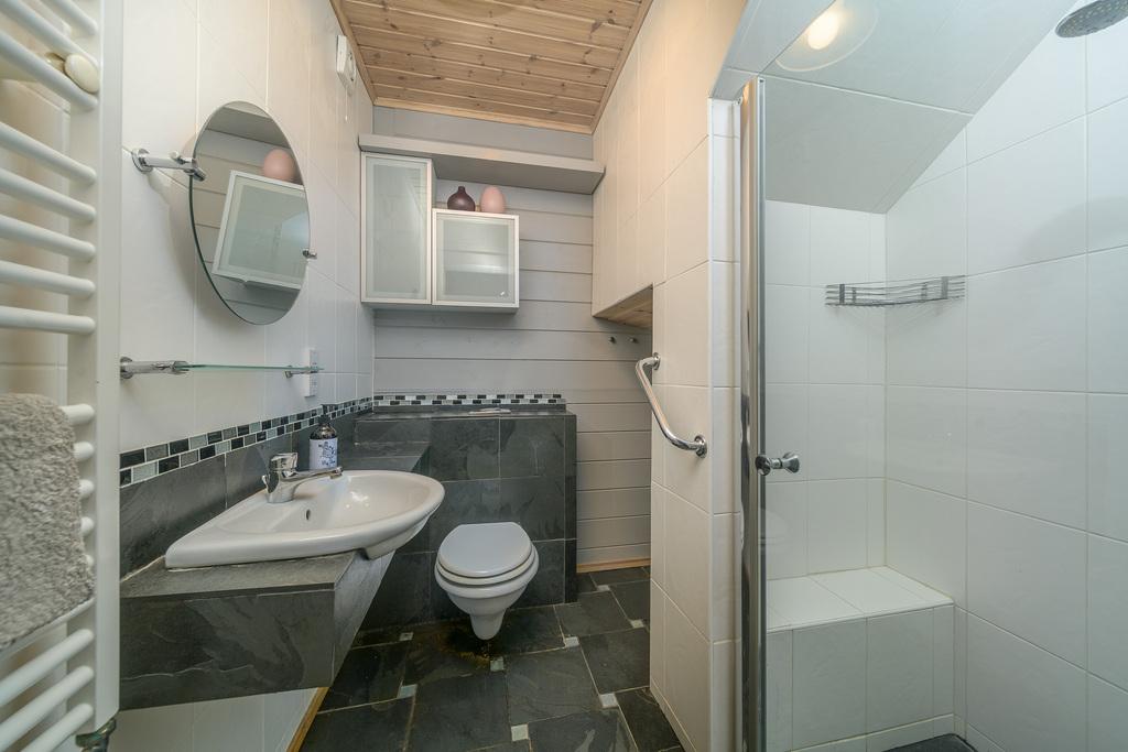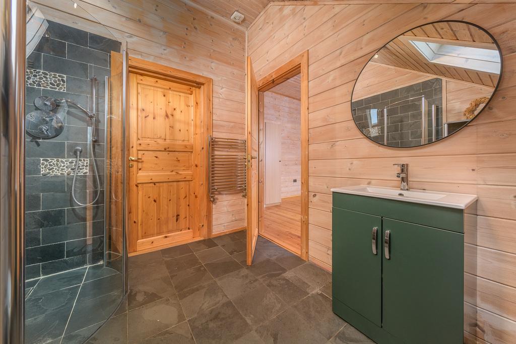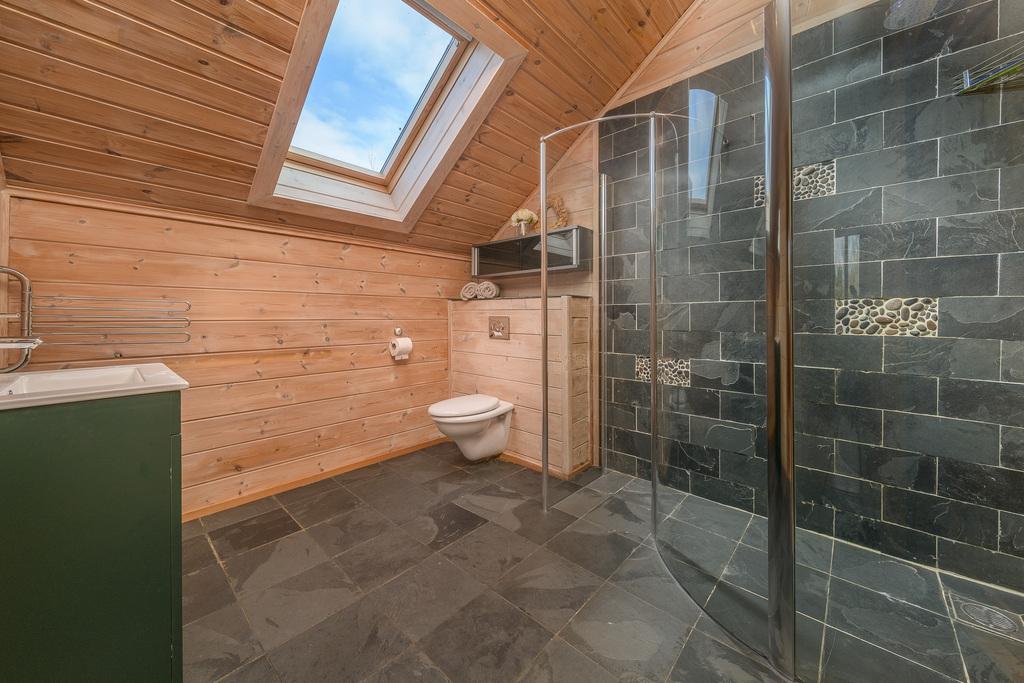 The family bathroom can be accessed directly the landing but is also adjacent to bedroom 3 so could be utilised as an en-suite of you so wished. The suite has been designed as a wet room and comprises a shower space with a water fall shower head and a separate shower head within, a concealed cistern toilet with a push button, a wall mounted cupboard, a towel rail and a hand wash basin on top of a bottle green coloured vanity unit with storage beneath. The space is finished with black slate-look tiling with a feature pebble tiled insert which is attractive.