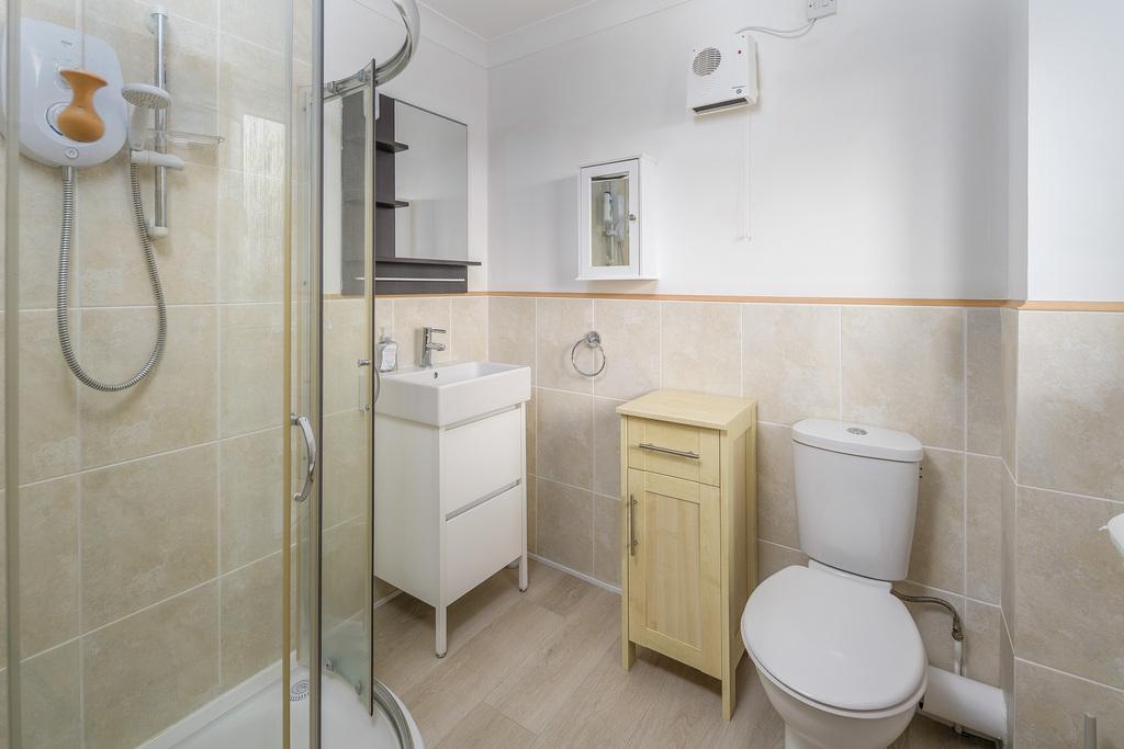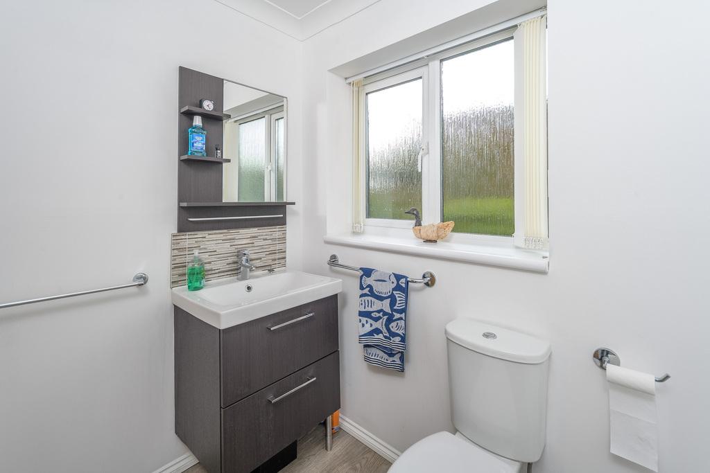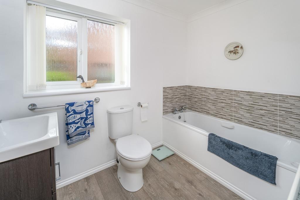 The family bathroom comprises a bath, a vanity unit with a hand wash basin on top, a wall fitted mirror with shelving below and a close couple toilet with a push button behind. A chrome heated towel rail and a radiator ensure added comfort. A window, with privacy glass, overlooks the side of the property and illuminates the décor and washed wood effect flooring perfectly.