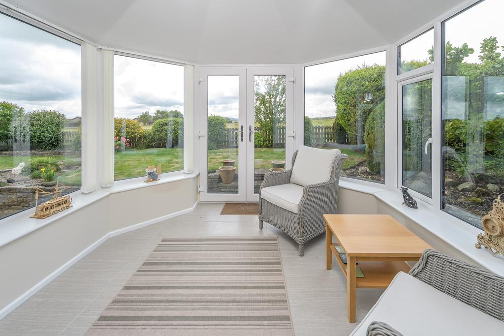 A pair of French doors open into a west facing garden room which captures the most beautiful views over open countryside to the Simonside hills beyond. This restful and relaxing room offers further comfortable living with a solid roof enabling the space to be used throughout every season: an ideal place in which to while away the hours enjoying the lovely garden views entering through the many windows and French doors which open out into the garden onto a paved area ideal for al fresco dining during the warm summer months.