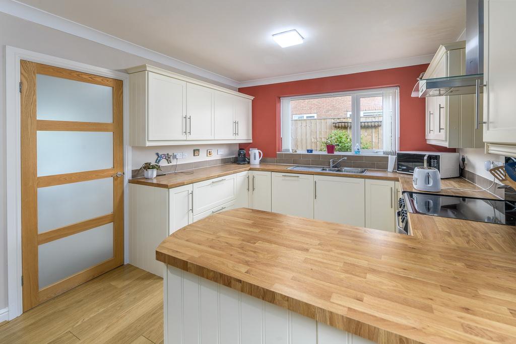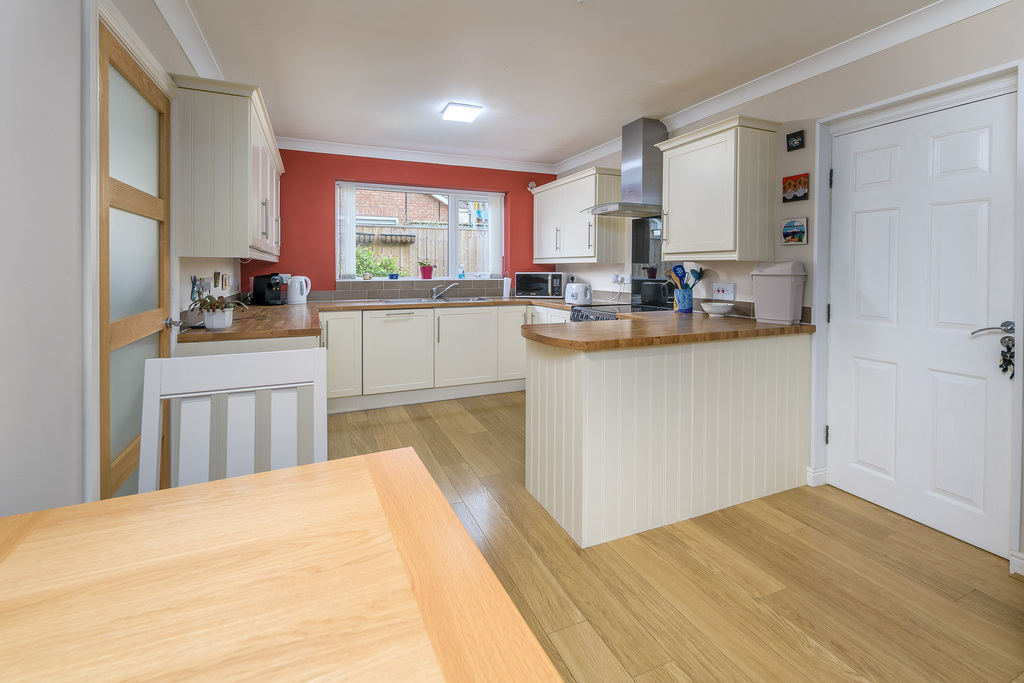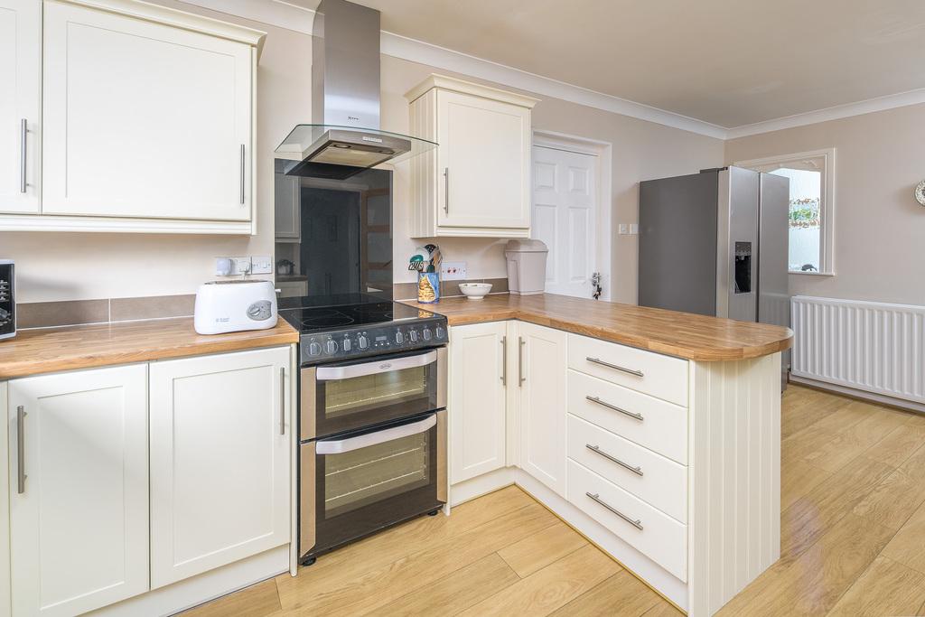 The spacious and airy kitchen which is beautifully light and bright offers a good number of modern wall and base units with a cream-coloured shaker style door complemented by a solid wooden work surface and attractive tile upstand which continues to the windowsill. There is a double bowl stainless steel sink beneath a large window overlooking the side of the property, a Bosch dishwasher and space for a free-standing cooker beneath a glossy black splash back and a NEFF stainless steel chimney style extractor fan, there is also space for a freestanding fridge freezer.