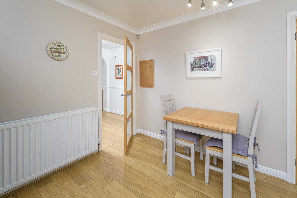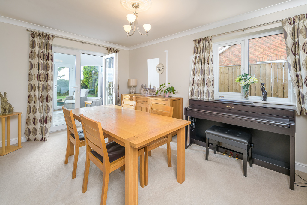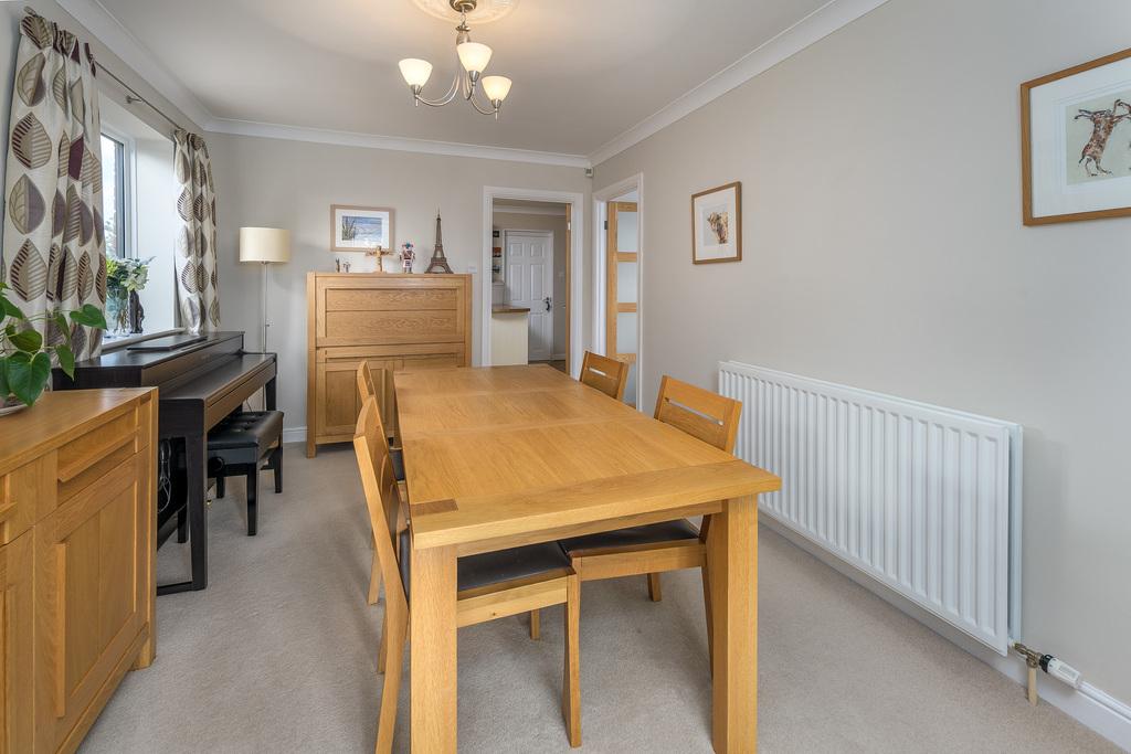 The dining room, with coving and a central ceiling rose, offers plenty of space to sit and dine in addition to accommodating a range of further furniture. A window to the side overlooks mature shrubs forming a pleasant view.