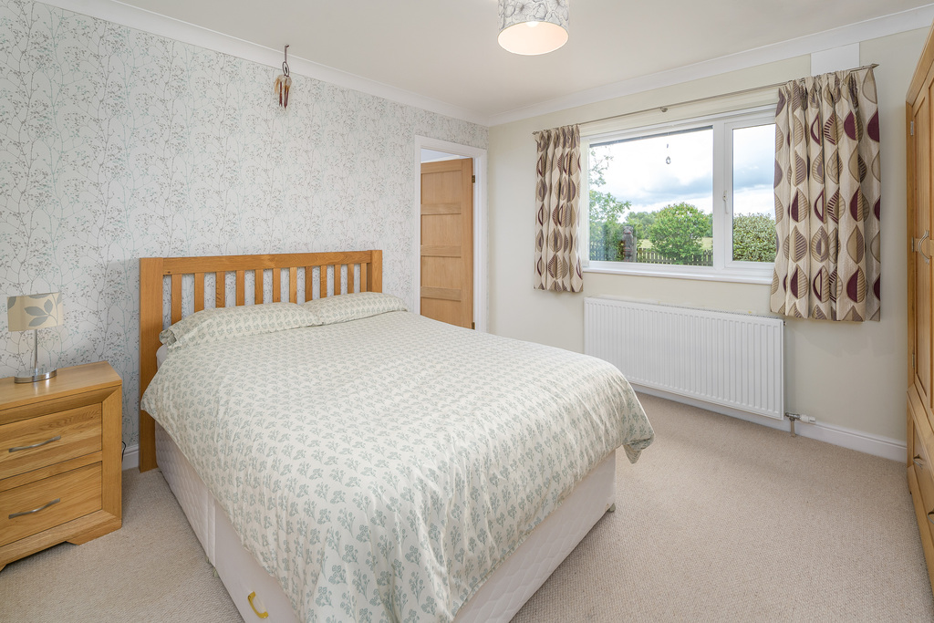 The primary bedroom is an impressive super-king sized room, with en-suite facilities, overlooking the rear of the property and capturing beautiful views over open countryside. There is plenty of space for additional bedroom furniture. The en-suite comprises a Quadrant shower cubicle with an electric shower within, a white high gloss vanity unit with a hand wash basin on top, a vanity shelf with an inset mirror, a white wall mounted unit, an extractor fan, a close coupled toilet with a push button behind, a heated towel rail and a free-standing vanity unit. The neutral beige tiling works in harmony with the light wood effect flooring all of which is illuminated by natural light entering via a window with privacy glass.