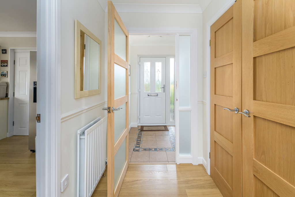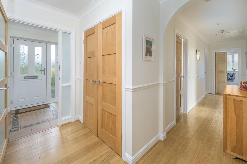 A shaped lawn framed by mature planting welcomes you to this attractive brick-built property. Entry is via a couple of steps which lead to the front door which opens into a spacious and airy entrance hall which benefits from a terracotta-coloured riven tiled floor, with a black and grey border, which is both practical and attractive. A dado rail adds character, and a partially glazed door opens into the main L shaped hallway, with lovely hard flooring and a dado rail, providing access to the principal living spaces in addition to a substantial fitted cupboard ideal for shoe storage and cloaks hanging.
