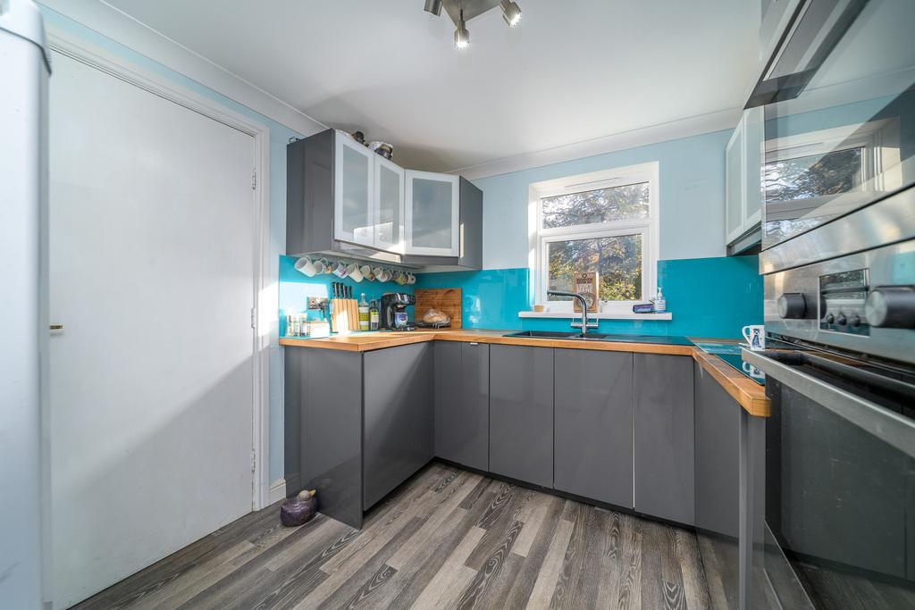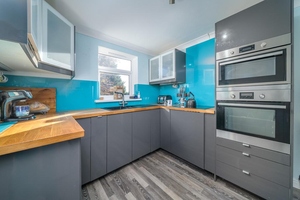 Located to the rear of the property, the well-designed kitchen offers a good number of base units with a high gloss grey door and wall units with an opaque glass door creating a stylish look. The units work in harmony with the contrasting wood effect work surface and sparkly blue splash back. In terms of fitted equipment, there is an acrylic sink with a water filter tap over, an induction hob and an oven with a microwave above. There is space for a free-standing fridge-freezer and space and plumbing for a slimline dishwasher. A window overlooks the rear of the property. A door leads into the single garage, with an up and over door, which offers excellent storage and useful utility space. The Baxi boiler is housed here for ease of access and a door opens to the rear garden.