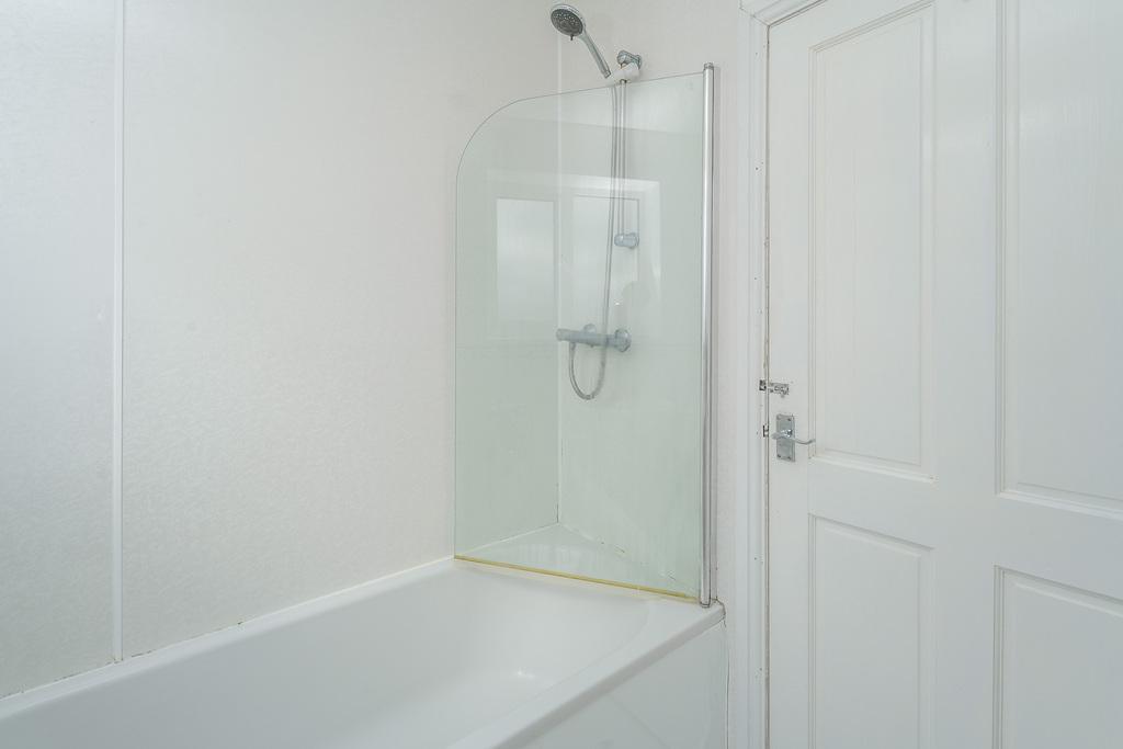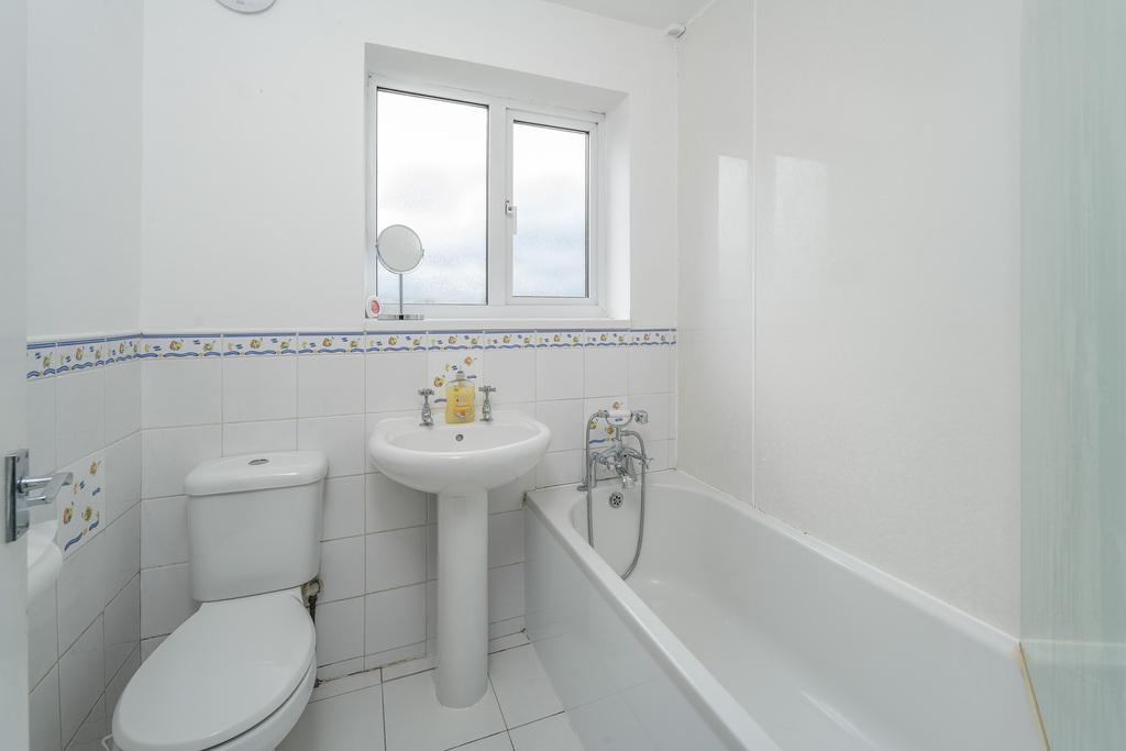 The family bathroom comprises a close coupled toilet with a push button behind, a pedestal hand wash basin, a white painted towel rail and a white bath with a shower over. The space is finished with white floor tiles and half height tiling blending with wet walling around the bath and shower areas creating a crisp and fresh look.