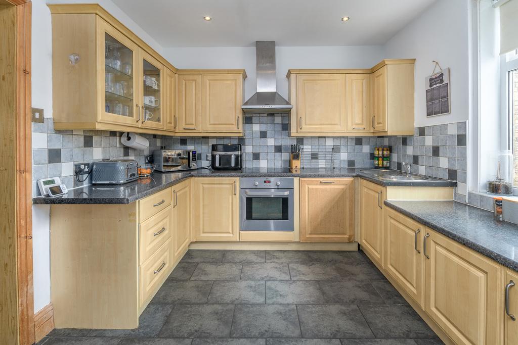 Leading from the lounge, the large kitchen diner, with attractive tiled floor, offers a good number of wall and base units with a wood effect door complemented by a contrasting stone effect laminate work surface and grey harlequin splash back tiling. In terms of fitted equipment, there is a dishwasher, an electric under bench oven, an induction hob with a stainless-steel chimney style extractor fan and a round single bowl stainless steel sink with a drainer at the side. There is space for a free-standing fridge-freezer. Natural light circulates courtesy of a large window overlooking the rear of the property and there is plenty of space to sit and dine whilst enjoying the countryside views.