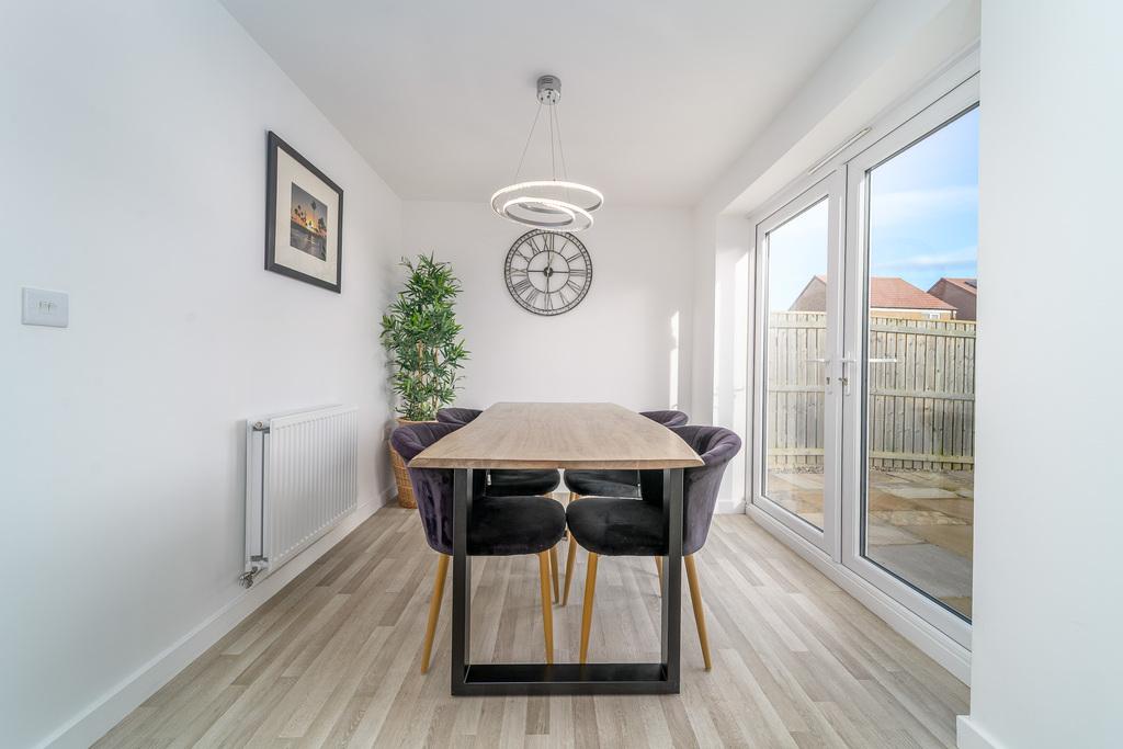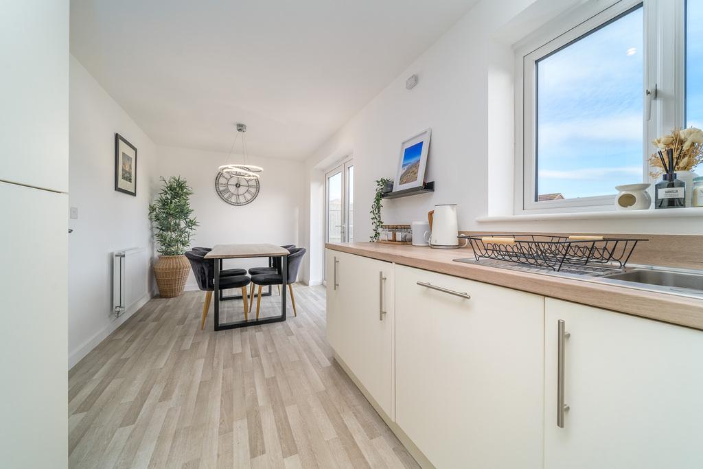 Located to the rear of the property, the kitchen-diner, with vinyl flooring, is a spacious and airy room with French doors taking advantage of views of the landscaped rear garden in addition to opening out to a patio ideal for al fresco dining. The kitchen features upgraded wall and base units complemented by a contrasting wood-effect work surface. In terms of fitted equipment, there is a dishwasher, a bowl and a half stainless steel sink beneath a window overlooking the garden, a four-burner gas hob beneath a stainless-steel splash back and chimney style extractor fan, an under bench electric oven, a full-sized fridge freezer and a Zanussi washing machine. The Logic gas boiler is housed in a wall unit for ease of access. There is plenty of space to sit and dine before the French doors which capture lovely garden views and facilitate free flow of movement between indoor and outdoor living.