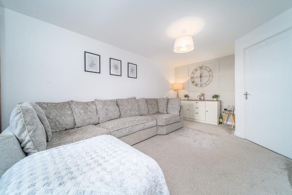 Entry is via the front door which opens into a spacious internal hallway which offers space to store shoes and hang cloaks and suchlike. A door leads from here into the lounge which is light and bright courtesy of a large window overlooking the open aspect to the front. The space is finished with a sumptuous grey carpet and a lovely feature panelled wall.