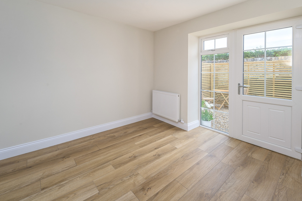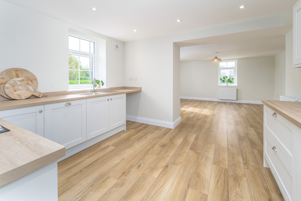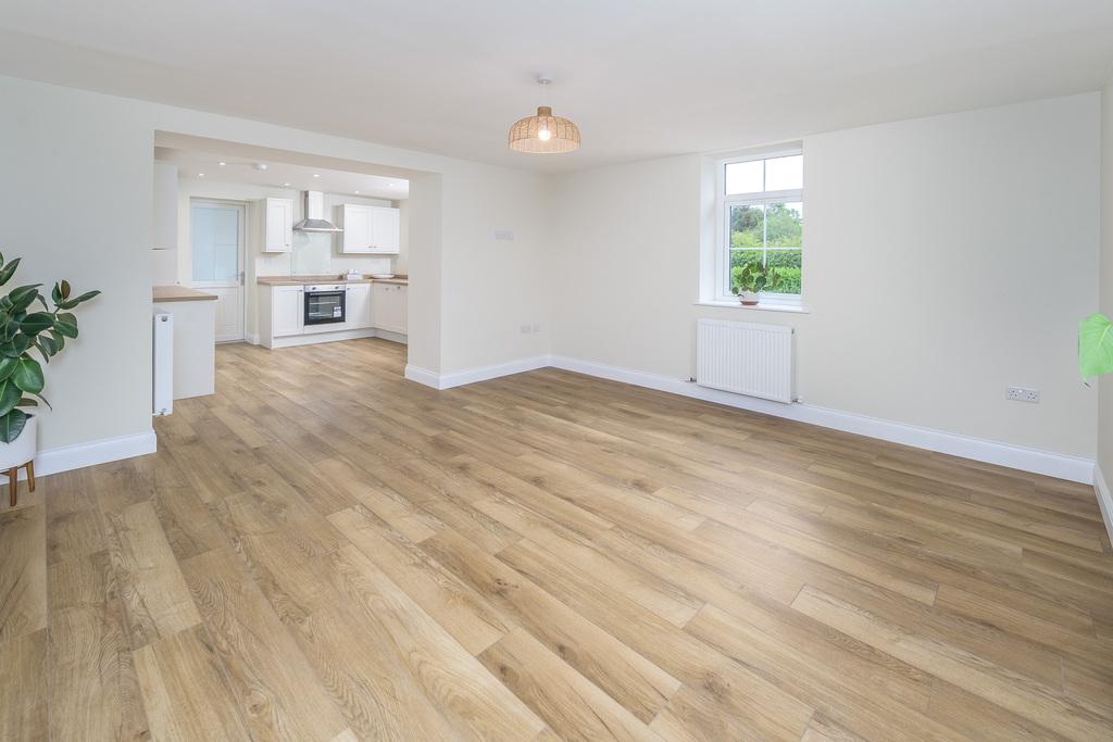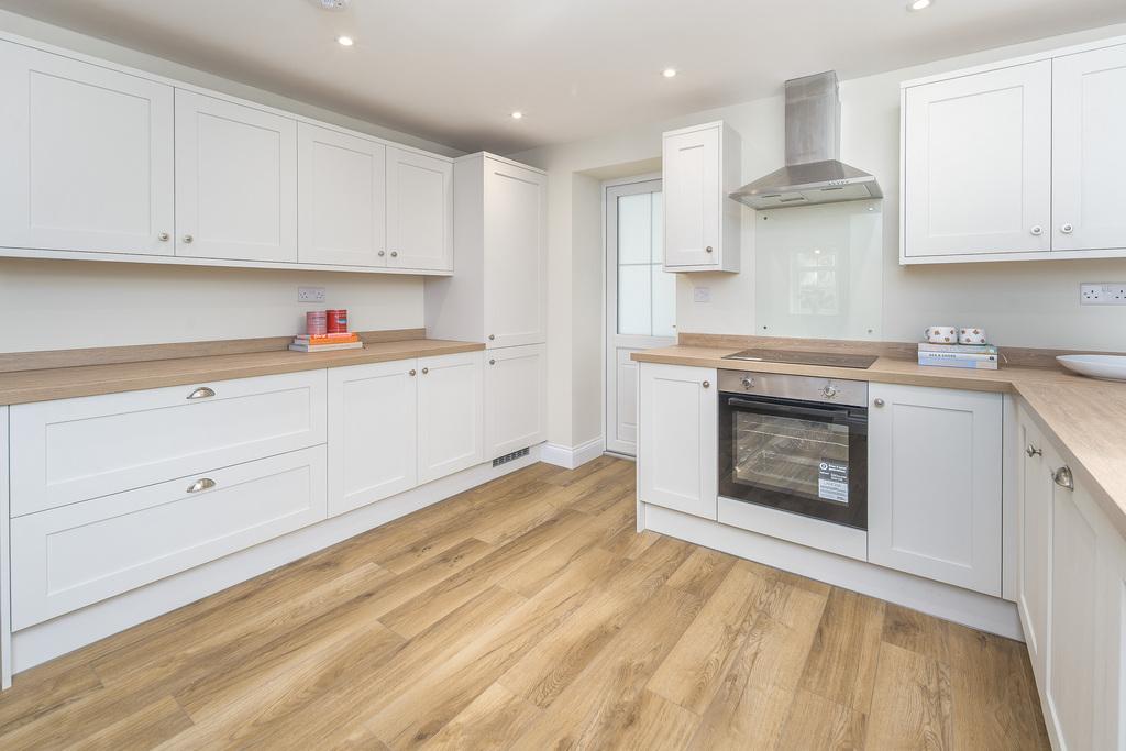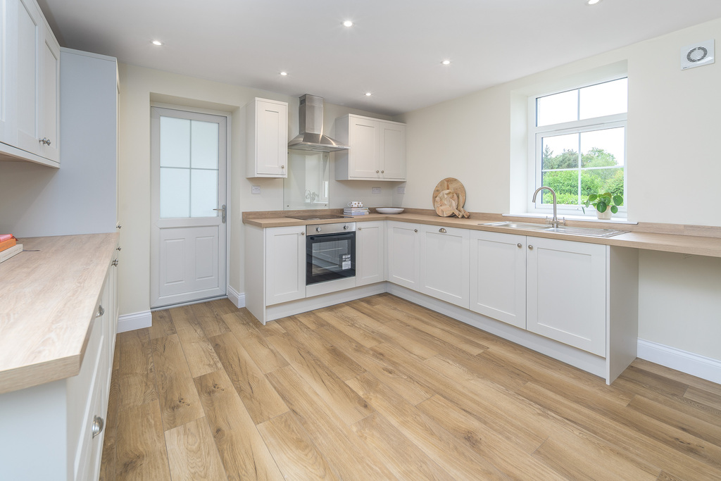 A quaint and attractive front garden frames this property beautifully. The composite front door opens into an internal hallway which provides convenient access to the principal living areas. The space is finished with quality wood-look flooring which continues through most of the ground floor creating a seamless transition between the different rooms. The first main door opens into a wonderfully spacious kitchen-dining-living room appealing to modern living where there is plenty of space for a dining table and accompanying chairs in addition to sofa. Two windows in the dining-living end take advantage of attractive views and the space then flows freely into a glorious kitchen which offers a good number of soft-close wall and base units with a light-coloured shaker style door complemented by a wood effect work surface with a matching upstand. In terms of fitted equipment, there is a full-size dishwasher, an under bench electric oven, a four-burner induction hob beneath a chimney style extractor fan with a glass splash back, a single bowl stainless steel sink and a full-size fridge freezer. A window within the kitchen captures a green and leafy outlook to the front. A uPVC door leads into a useful utility/boot room which houses the boiler and the large, pressurised water cylinder for ease of access. Loft access is available, a window overlooks the courtyard garden and there is a further door providing external access.