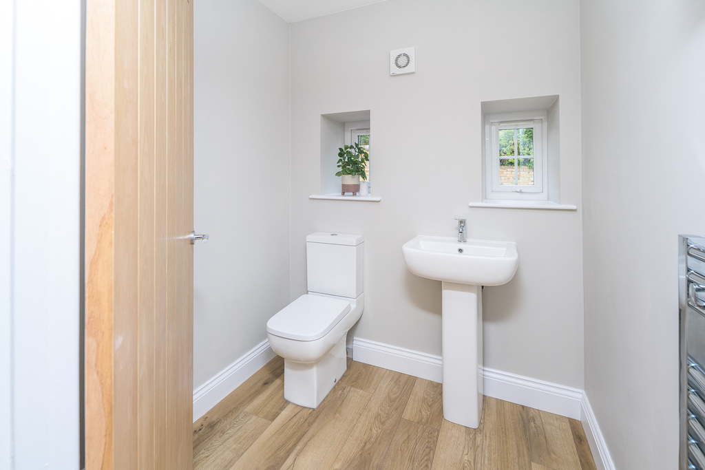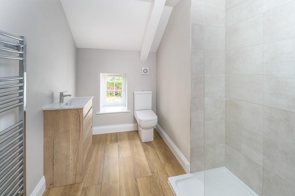The ground floor WC is superb as it negates the need to continually frequent the upstairs facilities. The suite comprises a close coupled toilet with a push button behind, a pedestal wash hand basin and a chrome heated towel rail. A window allows for natural light and ceiling spotlights add to the brightness.