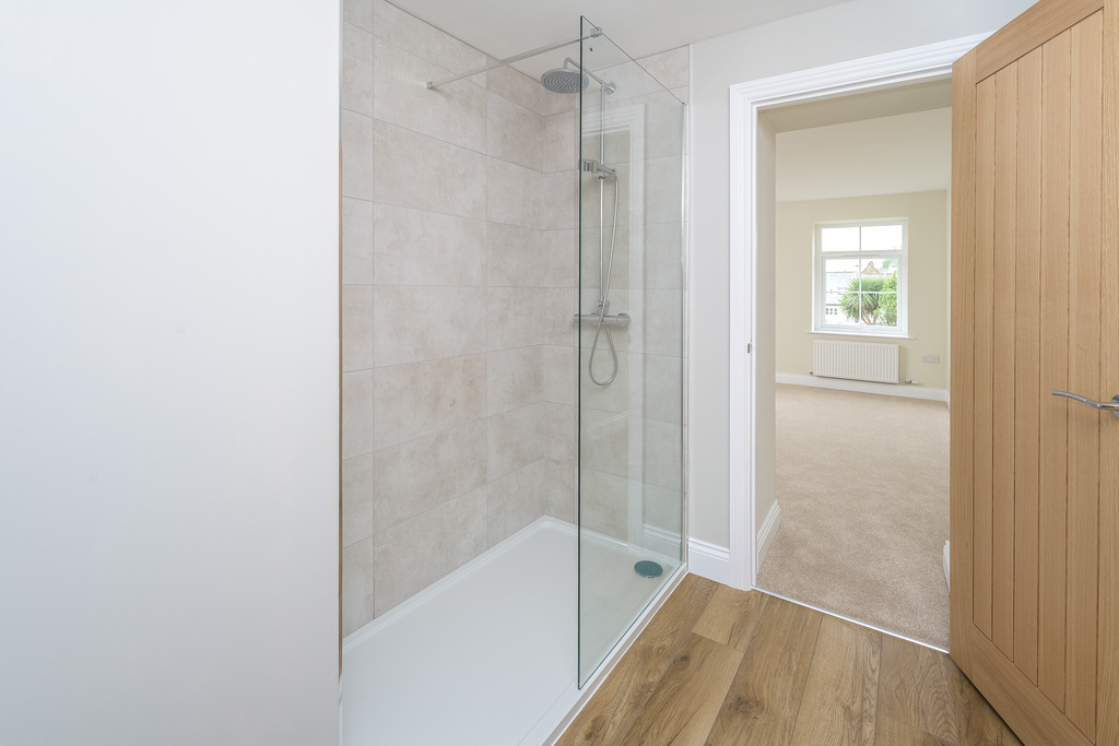 The primary bedroom is a spacious super king-sized room benefiting from en-suite facilities. Two large windows overlook the front of the property and illuminate this tastefully decorated room perfectly. The en-suite, with wood look flooring, comprises a vanity unit with a hand wash basin on top and two drawers beneath, a close coupled toilet with a push button, a slimline shower tray with a glass walk behind screen and a waterfall shower head and a separate shower head within, an extractor fan and a chrome heated towel rail ensures added comfort. A window allows or natural light and the space has been finished with attractive tiling.