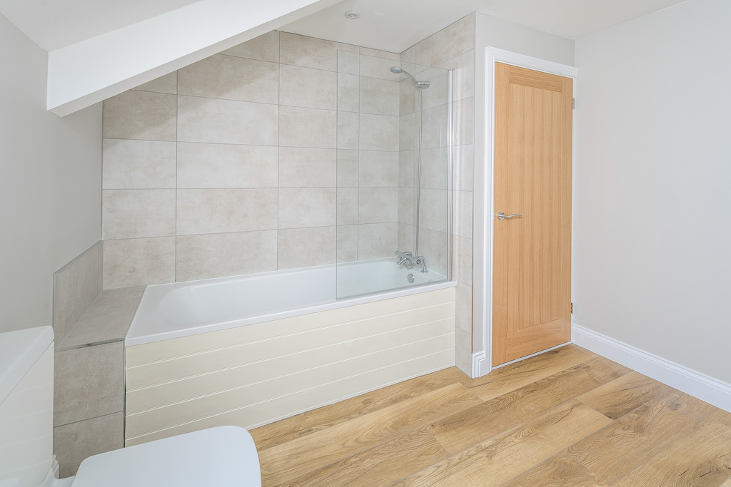 The family bathroom, with wood-look flooring, comprises a wood-effect vanity unit with a hand wash basin on top and storage beneath, a close coupled toilet with a push button behind, an extractor fan, a white bath with a glass shower screen and taps over and a chrome heated towel rail. The space around the bath and shower area has been tiled, natural light enters via a window and within the shaped ceiling, spotlights add to the brightness.