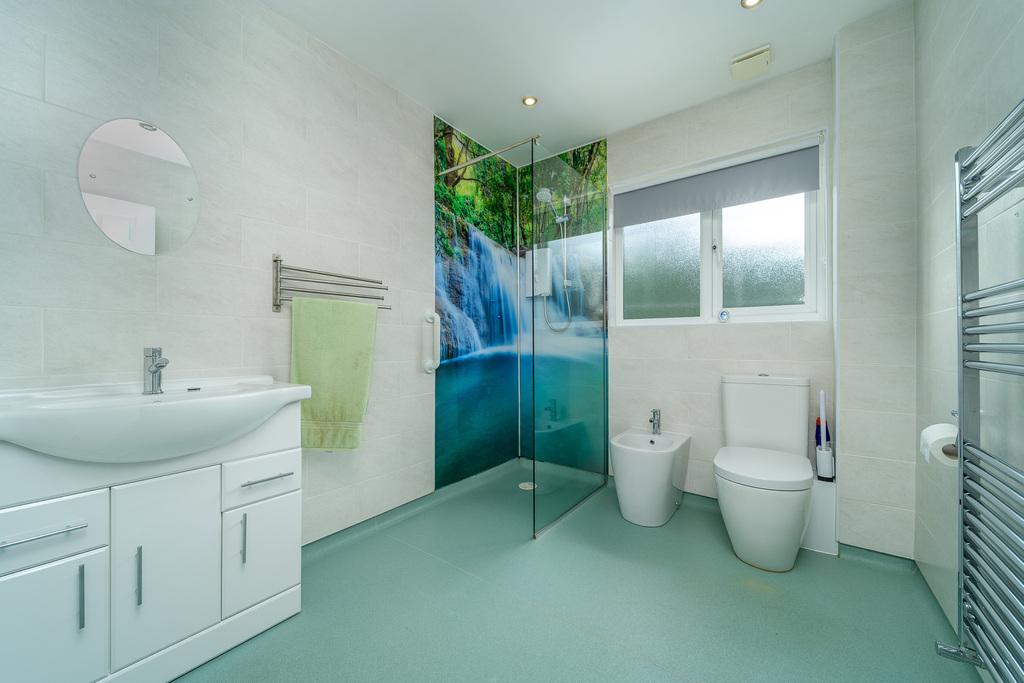 The family bathroom comprises a shower cubicle with an electric shower within, a bidet, a close coupled toilet with a push button behind, a large semi-recessed hand wash basin on top of a vanity unit with storage beneath, a wall mounted towel rail, an extractor fan and radiator. The wet wall within the shower depicts a waterfall scene which enhances the space beautifully and the neutral tiling around the remaining walls creates a crisp and fresh look. A window, with privacy glass, overlooks the rear.