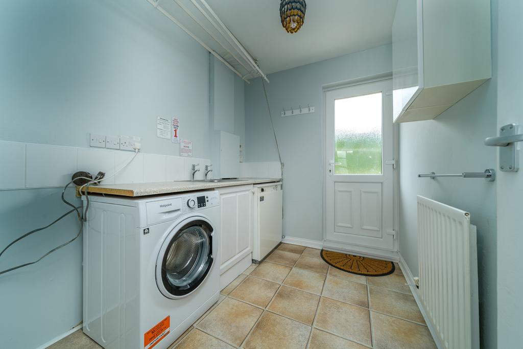 The kitchen is spacious and offers a good number of wall and base units with a dark pine door complemented by a specked-effect contrasting work surface and a tiled splash back. There is a bowl and a half white sink with a mixer tap above and space for a free-standing oven and an under-bench fridge. The room is finished with stone effect vinyl flooring, and a large window allows for natural light in addition to providing uninterrupted views over the rear garden. The utility room, housing the boiler ease of access, offers space and plumbing for a washing machine, a single bowl stainless steel sink within the work surface and further storage cupboards. A door provides external access, and the floor is practically finished with vinyl flooring ideal for muddy boots. A partially glazed door returns to the hallway.