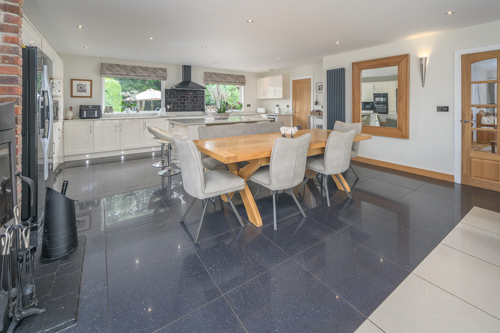 Further down the hallway is the impressive kitchen/dining/family room which is yet another amazing space, filled with light courtesy of two large sets of sliding doors to the front and side, the latter offering a lovely aspect over the landscaped gardens as well as a field beyond. Both sets are adorned with colonial shutters which are very pleasing on the eye. An attractive wood burner set within a floor to ceiling brick wall gives an almost country cottage feel to the room as well as being the ideal addition when the nights draw in. Wall and ceiling lights are available at this end of the room to create your perfect ambience and tiling to the floor in a mixture of cream and black contrasts beautifully with the stonework around the fire. The kitchen section of the room offers a large number of wall and base units with a sleek, high gloss door along with ample quarts bench space which benefits from a matching upstand and black brick-style splashback tiling provides a striking contrast. There is a NEFF eye level double oven, a built in NEFF microwave and a four burner induction hob with a chimney style extractor fan above. In addition there is space for a free standing American style fridge freezer, a fully integrated dish washer and a free standing wine cooler. A large centre island offers further storage and there is also a breakfast bar area. A larder style pull out is also available along with a bowl and a half stainless steel sink. Two windows offer fabulous views over the rear garden and also allow natural light to stream into the space with plinth lighting along with ceiling spotlights adding further brightness to the space. Plenty of space is available in the centre of the room to place a dining table and chairs if required. Designer radiators give a further touch of luxury to this stunning space and ensure this large space is warm and toasty when required.