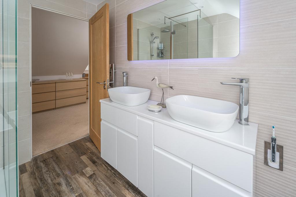 The first floor at this impressive home is reached via the stunning glass panelled staircase which is beautifully enhanced by little lights to the side. The pleasant open landing has a nice shaped ceiling lit by spotlights and there is also a Velux for natural light. There is access to a large walk-in cupboard which is ideal for storage. Three further double bedrooms are located on this floor and all benefit from ensuites.