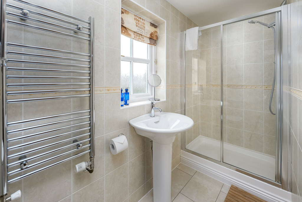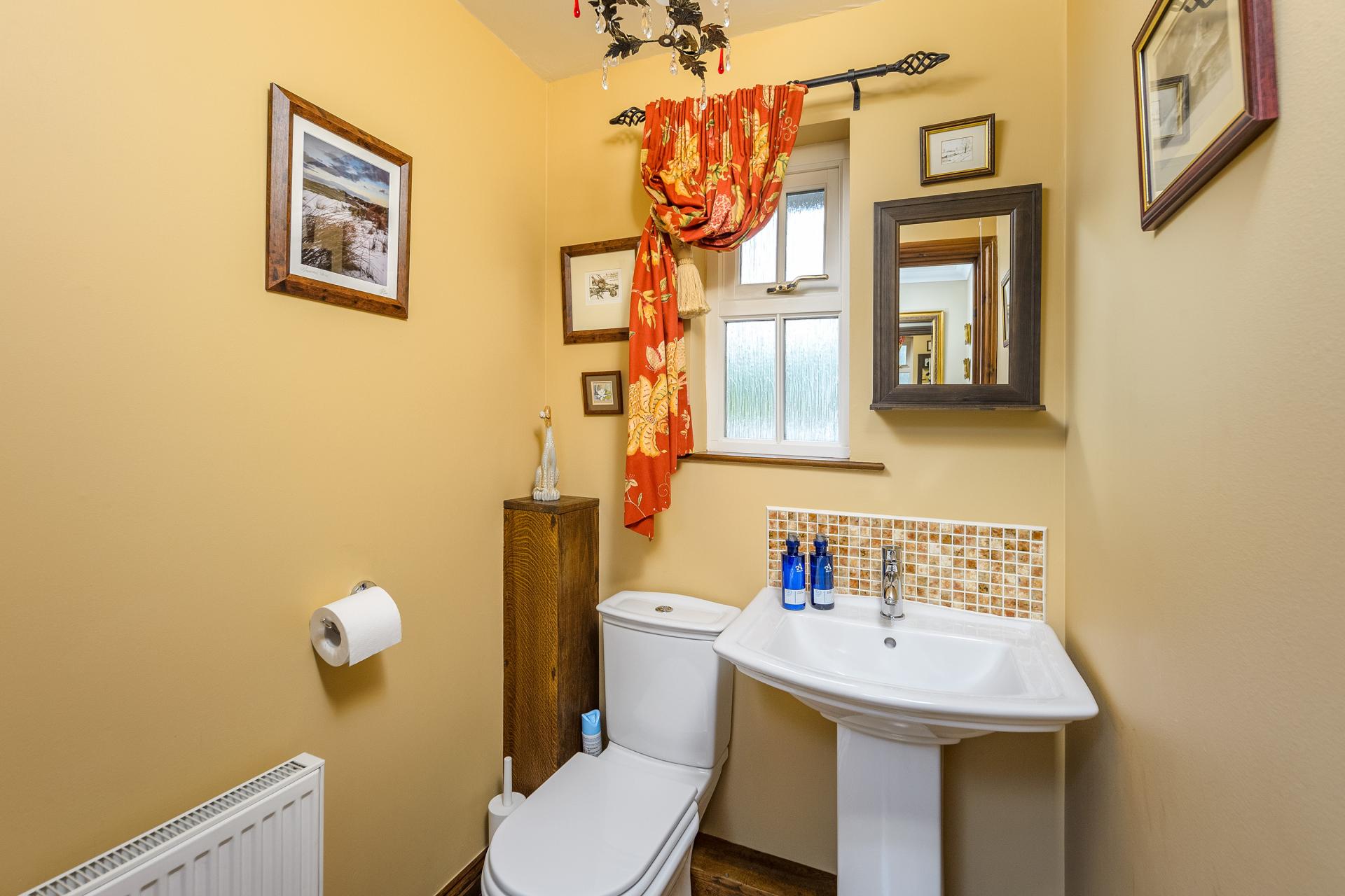 The stylish ground floor WC is a superb asset as it negates the need to continually frequent the upstairs facilities. The suite comprises a close-coupled toilet with a push button, a particularly wide pedestal wash hand basin with a delicate mosaic splashback tile behind and a window allowing for natural light.