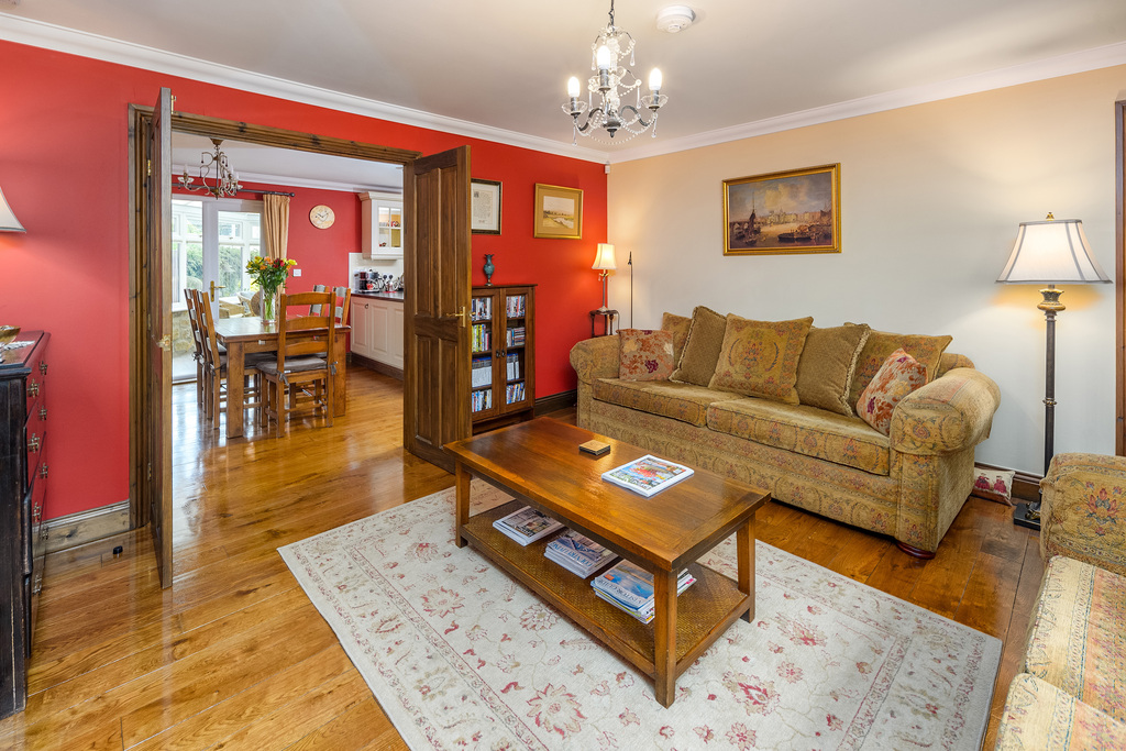 Entry is via the front door into an impressive internal hallway which showcases quality oak flooring, extending through to the living-dining area, and attractive coving, which is a feature in many of the rooms. Various doors lead off and stairs, with coir carpet, ascend to the first floor. There is a useful cupboard beneath the stairs which offers excellent storage potential. The quality of the doors, which have been stained to match the deep skirting boards and architraves throughout, are just one example of the high-quality finish offered by this glorious property.