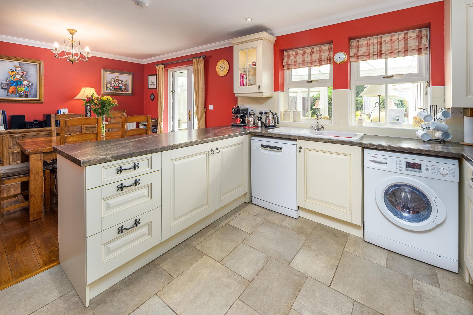 The superior kitchen offers plenty of wall and base units, including three illuminated glass display cabinets, with a light-coloured country cottage-style door with pewter-coloured handles complemented by a granite effect work surface and neutral splash back tiling. The well-equipped kitchen includes a large white ceramic sink with a pretty Victorian-style tap above, space for a large range cooker and space and plumbing for a full-sized dishwasher and washing machine. The newly replaced gas boiler is housed in a cupboard in the corner for ease of access. Two windows provide a view into the conservatory which forms an attractive feature with a stone wall base and LVT flooring.