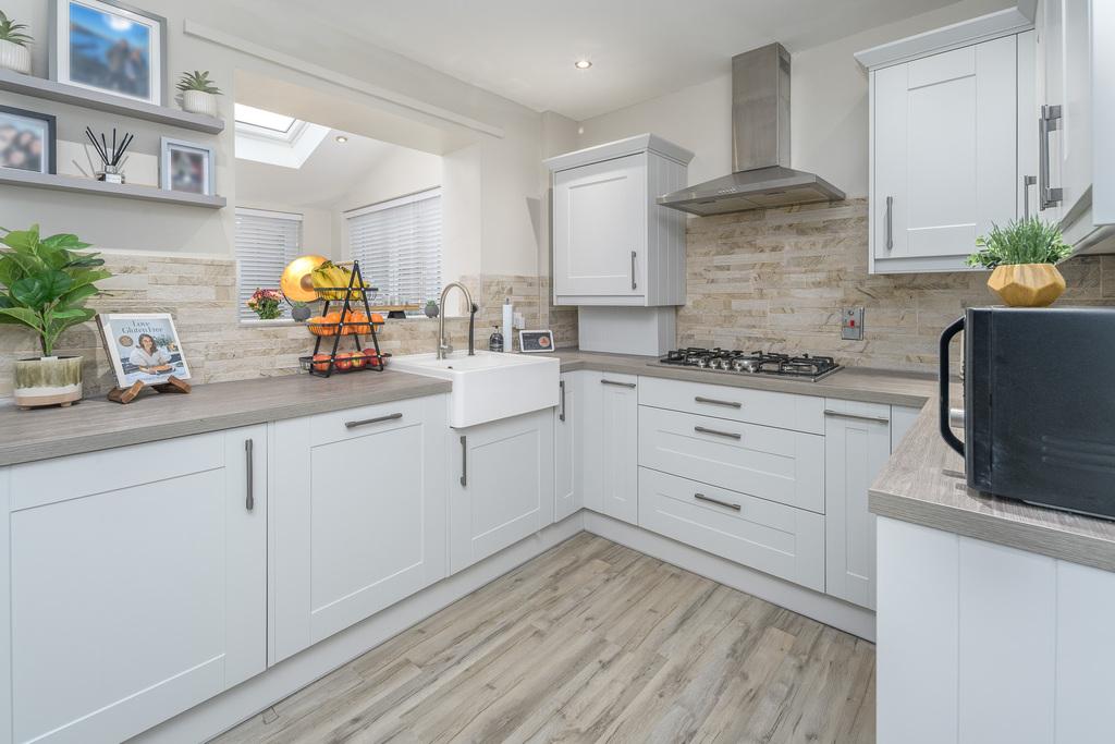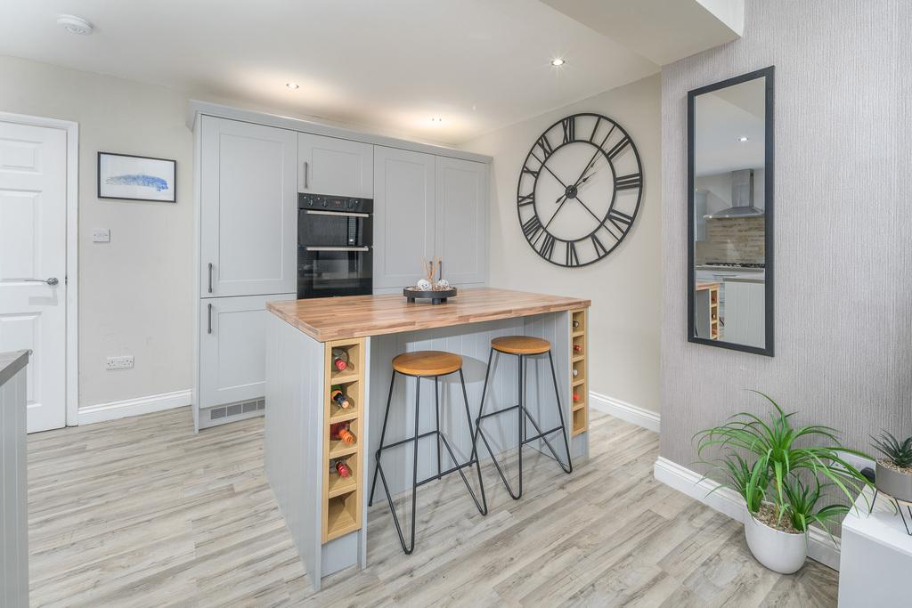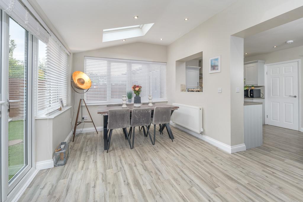 Impressive in size and beautifully light and bright, the living-kitchen-diner is a gorgeous room located to the rear of the property. Appealing to modern living, this room presents a sociable open plan space in which to spend time with family and friends. The delightful and well-equipped kitchen offers a good number of wall and base units with a light-coloured grey shaker style door complemented by a contrasting grey laminate work surface, stone effect brick style tiling and attractive flooring. In terms of fitted equipment, there is a fridge freezer, a double oven, larder cupboards, a five-burner gas hob beneath a stainless-steel chimney style extractor fan, drawer units, a Belfast sink, a dishwasher and a washing machine. The kitchen also boasts a centre island with matching base units and a wood effect laminate work surface which offers further storage, two wine racks and seating space. The boiler is housed in a wall unit for ease of access. The space flows freely into the dining area where there is plenty of room to accommodate a dining table and accompany chairs beneath a large Velux window which allows a wealth of natural light. There is further space for a settee where you can relax before the wall mounted television. The room continues to impress with French doors which open out to the patio within the rear garden which is the ideal space to enjoy al fresco dining with family and friends.