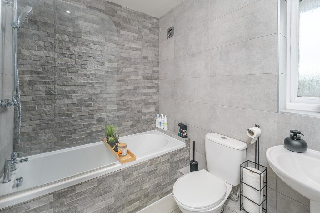 The family bathroom comprises a white bath with a waterfall shower head and a separate shower head over behind a glass screen, a close coupled toilet with a push button behind, a pedestal hand wash basin and a chrome heated towel rail. The space is fully tiled, the light grey plank effect floor tiles working in harmony with the mid-grey tiles adorning the walls and a window allows for natural light.