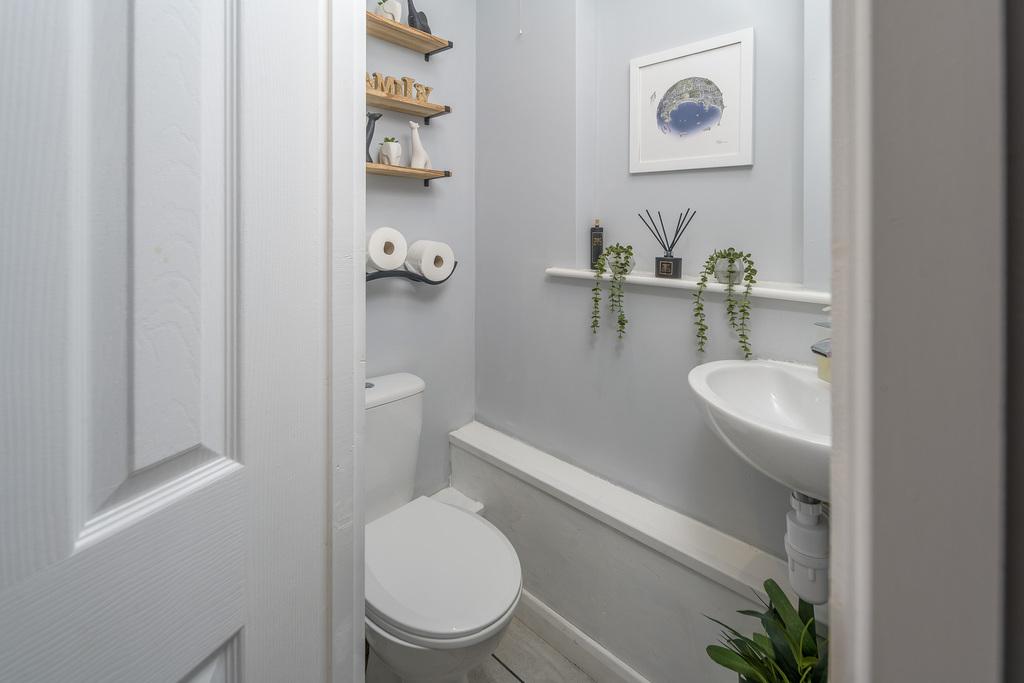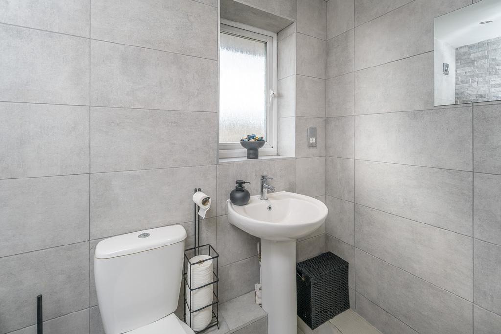 Entry is via the front door which opens into a useful entrance porch which offers space to hang coats and store shoes. The floor is practically tiled and the sloped ceiling with recessed spotlights, adds to the sense of space offered. A partially glazed door leads to the main hallway where various doors lead off to the main living spaces. The ground floor WC is a superb asset as it negates the need to continually frequent the upstairs facilities. The suite comprises a close coupled toilet with a push button flush and a corner hand wash basin with a chrome mixer tap above. The space is finished with a tiled floor and a wall mounted extractor fan.