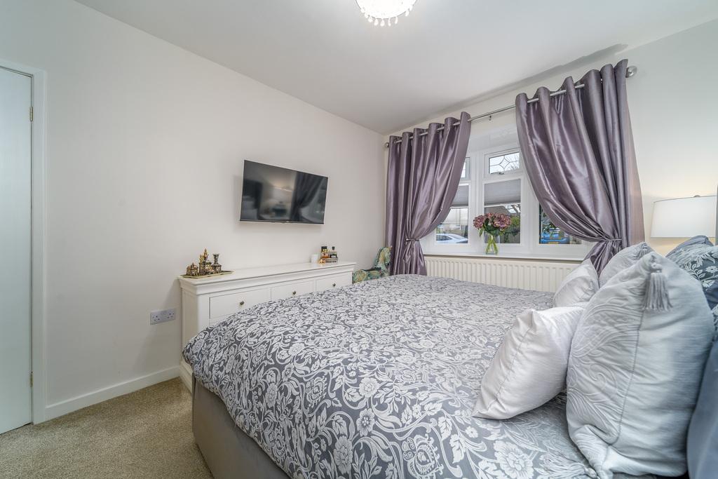 The principal bedroom is a large light and bright double room with bow window, with blinds as in the living room, overlooking the front of the property. There is plenty of space for a range of bedroom furniture and space and fittings for a wall mounted television. The room is finished with wood-effect LVT flooring creating a sleek and stylish look.