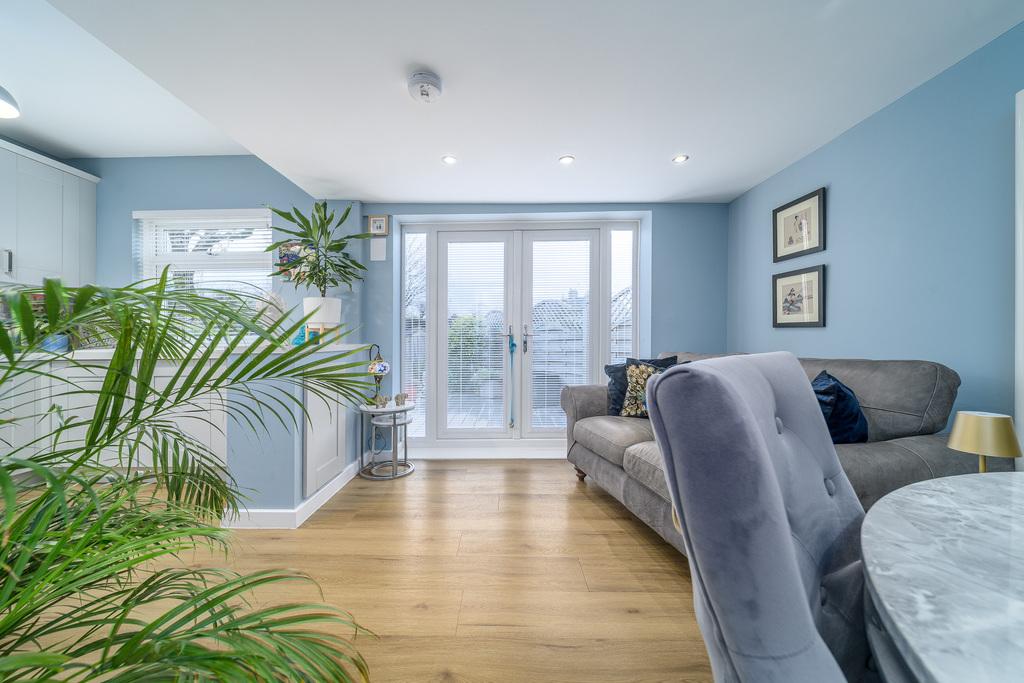 The kitchen-diner is a lovely contemporary room appealing to modern living. The kitchen offers a good number of wall and base units with a grey shaker style door complemented by a pale-coloured quartz work surface and brick style splash back tiling with a blue-grey pattern which works in harmony with the overall décor. There is an under-bench Zanussi double oven, a four-ring ceramic hob beneath a chrome style extractor fan, an under bench integrated fridge, a fitted slimline dishwasher and a white enamel sink with a drainer at the side. The Worcester boiler is housed in a cupboard for ease of access and a large window provides uninterrupted views of the rear garden. There is plenty of space to sit and dine in addition to relaxing on a settee before a pair of French doors which open out to the rear garden facilitating free flow of movement between indoor and outdoor living. This is a lovely sociable space as you are easily able to chat to family and friends in the dining end whilst creating culinary delights within the kitchen.