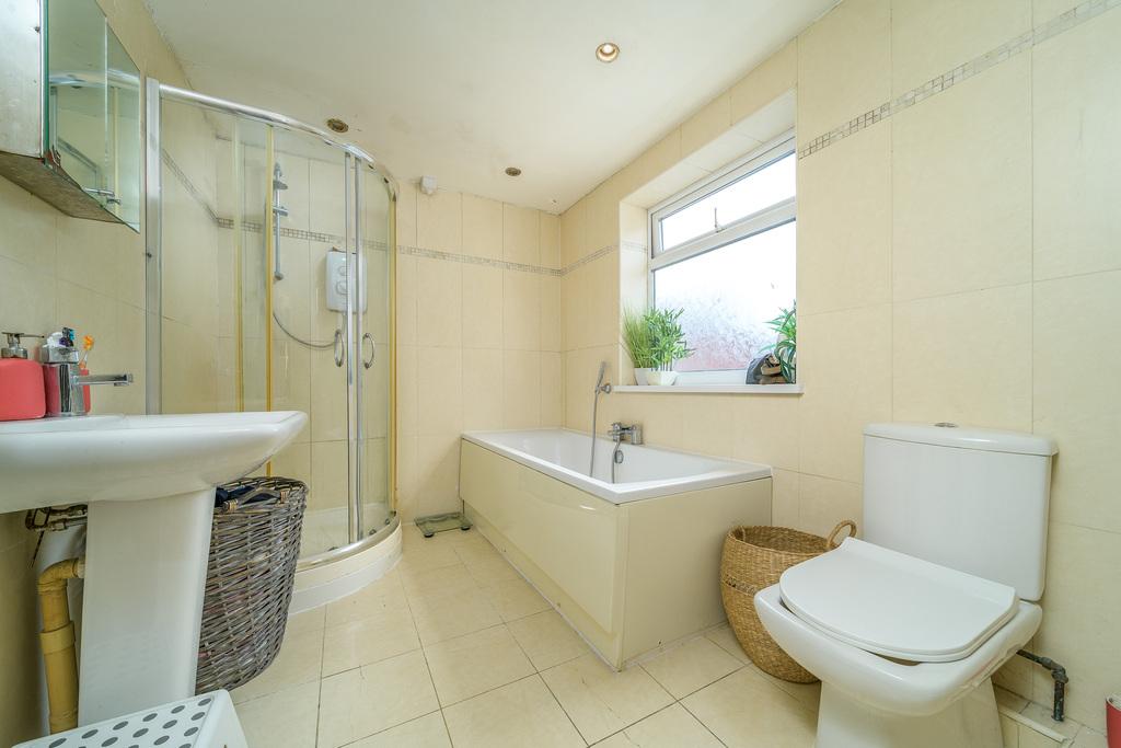 Taking the stairs to the first floor, the half landing opens to the fully tiled family bathroom. The suite comprises a chrome heated towel rail, a pedestal wash hand basin, a corner shower cubicle with an electric shower within, a large white bath with shower taps over and a close coupled toilet with a push button behind. There is a built-in cupboard which houses the gas boiler for ease of access. Two windows to the side allow for natural light and ceiling spotlights add brightness.