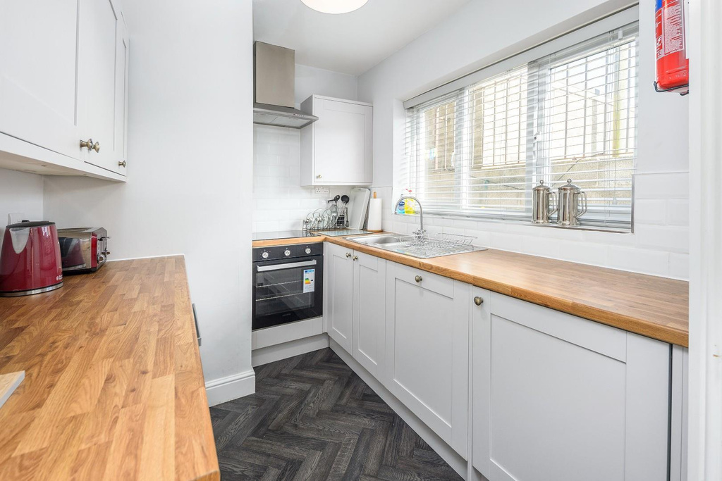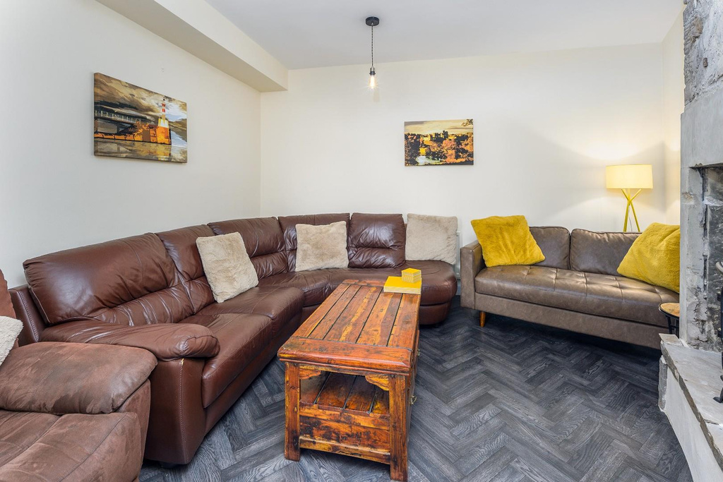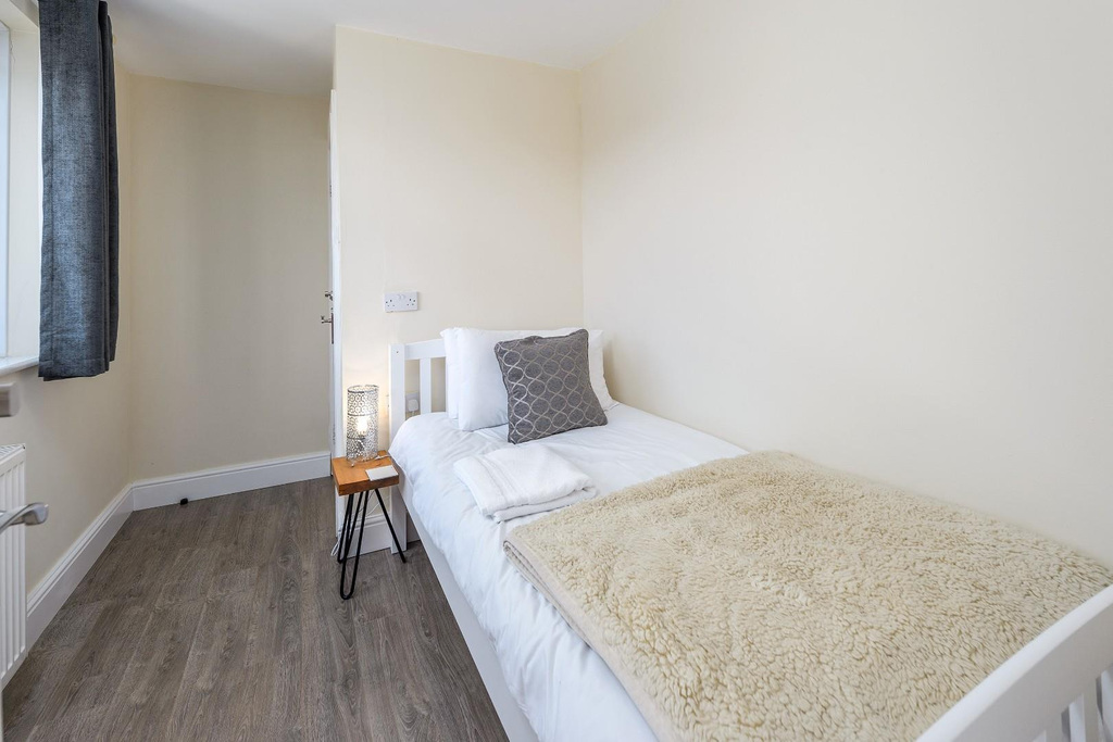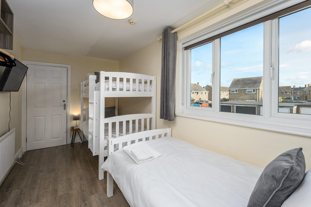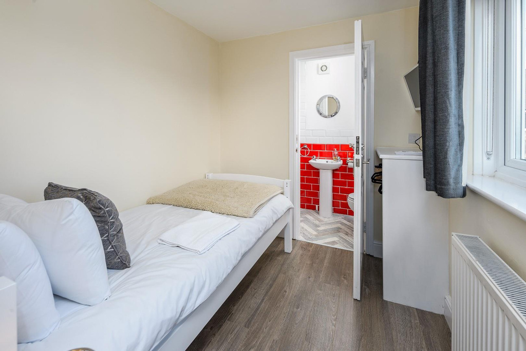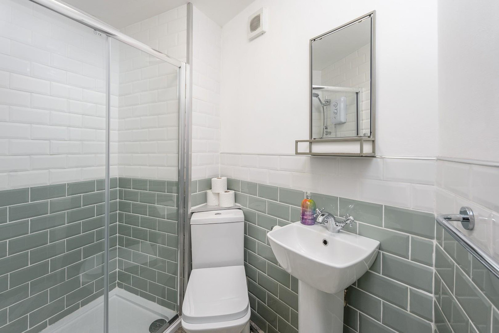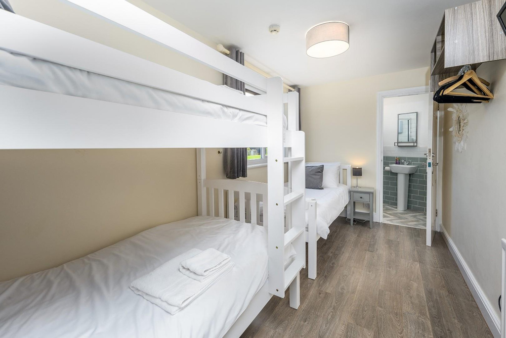 Bedroom 4 is a triple room, with one bunk bed and one single bed making a great children’s room. More great flooring and a lovely large window providing lots of natural light finish the space off well. The ensuite provides quality white and green brick-style tiling, and is equipped with a corner toilet, a pedestal hand basin, and a slimline shower tray with an electric shower and glass sliding door. A big window provides lots of natural light.