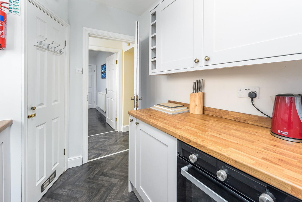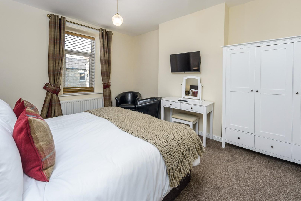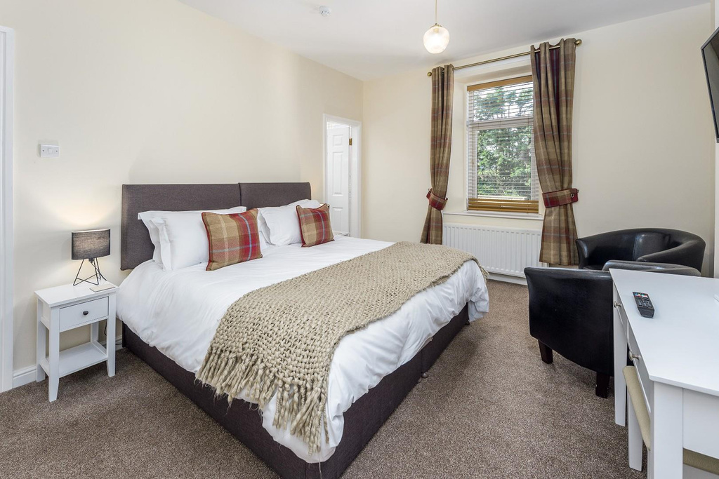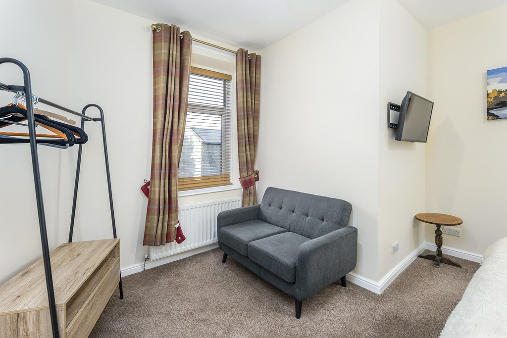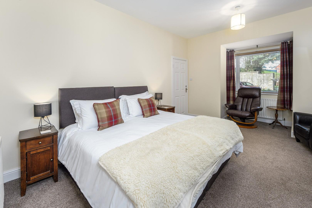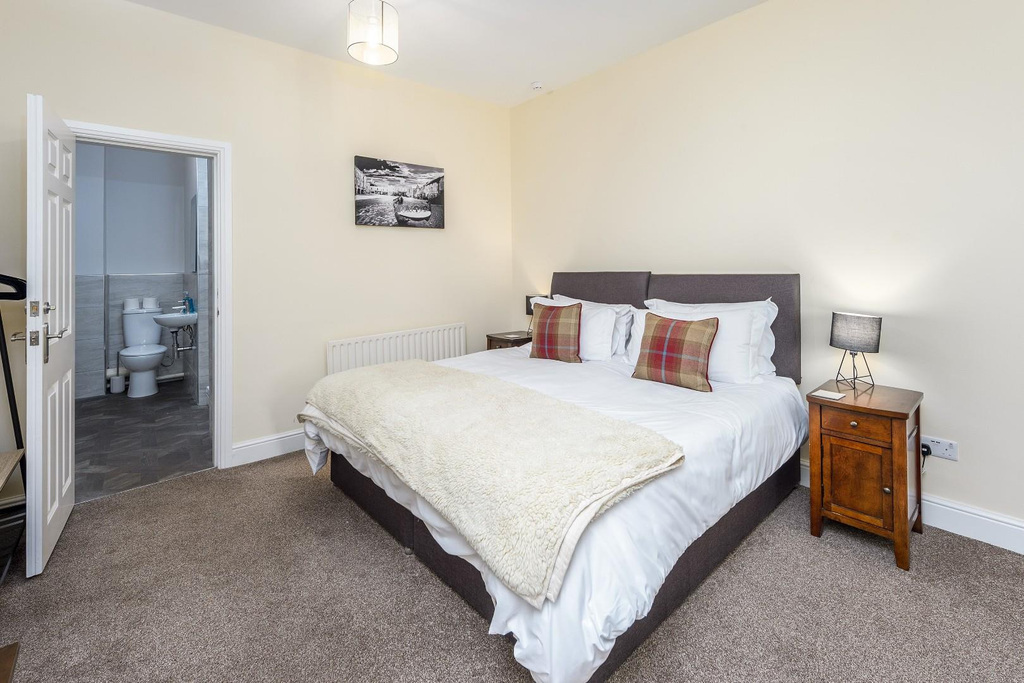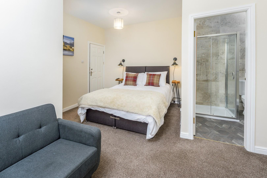 At the front of the house, opposite the sitting-room, is a good-sized double bedroom. This room would be great for anyone requiring an accessible bedroom and bathroom. The box bay window overlooking the front of the home adds a lovely touch to this neutrally decorated but very well presented space. The ensuite offers really nice grey tiling, lovely quality flooring, a close-coupled white toilet, a wall hung hand basin, and a good-sized shower cubicle with an electric shower behind a glass shower screen.