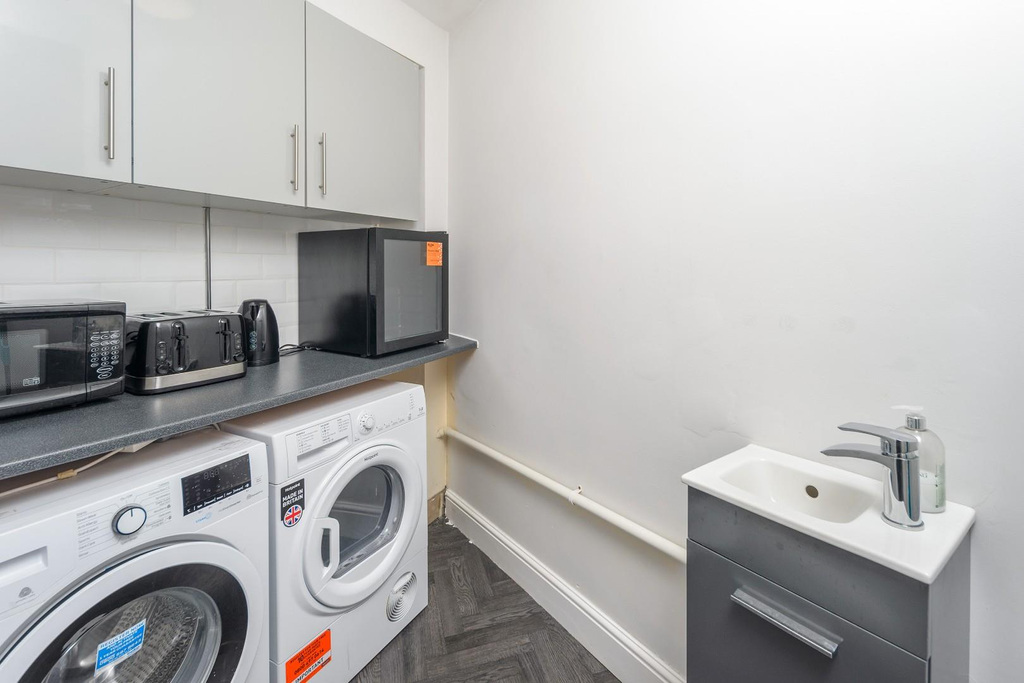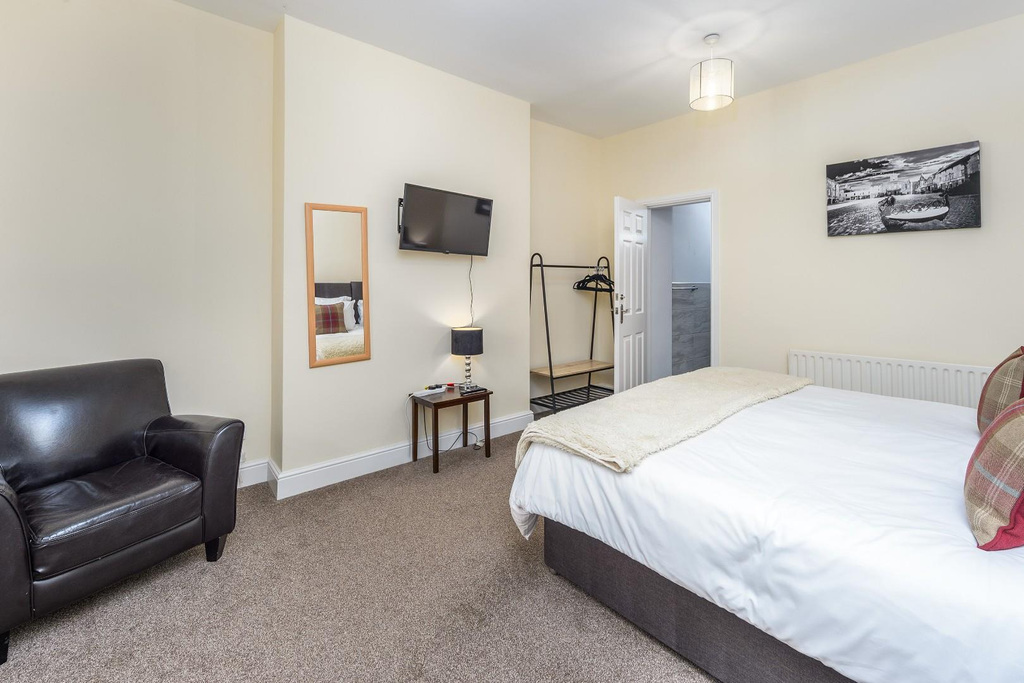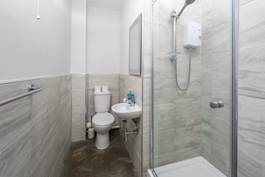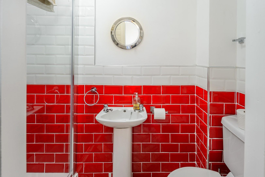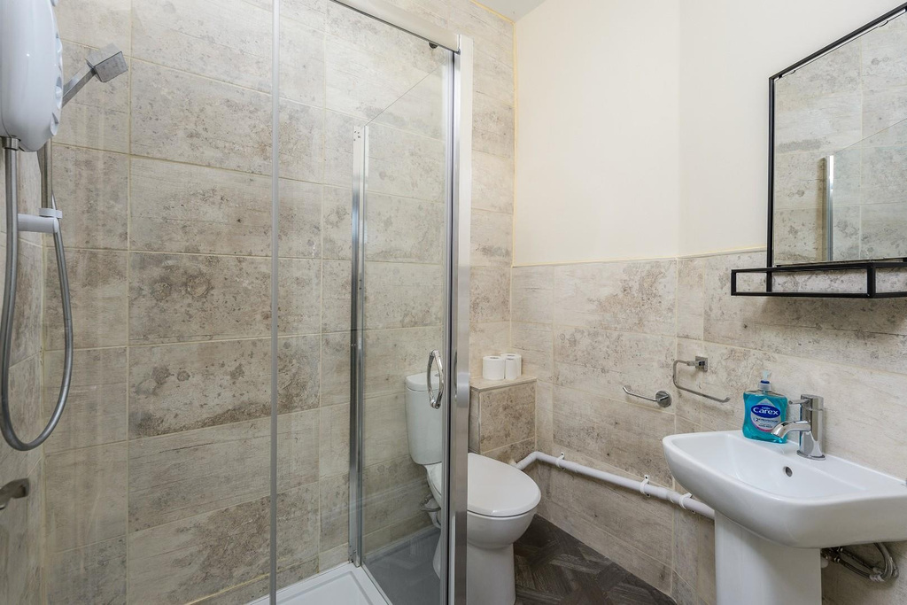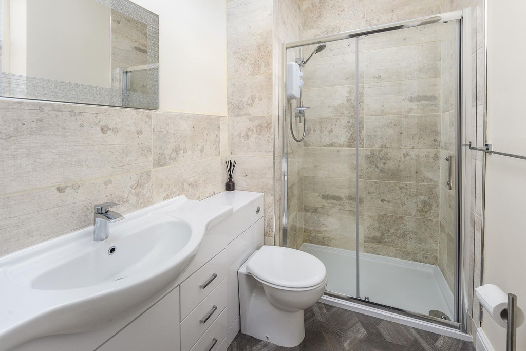 Bedroom 5 is a neutrally decorated single bedroom, with a window to the rear of the home and great wood-effect flooring. Its ensuite is decorated with really pretty red and white brick-style tiles, and the room is equipped with a glass shower cubicle, a pedestal hand basin, and a white close-coupled toilet. Furniture fixtures and fittings included.