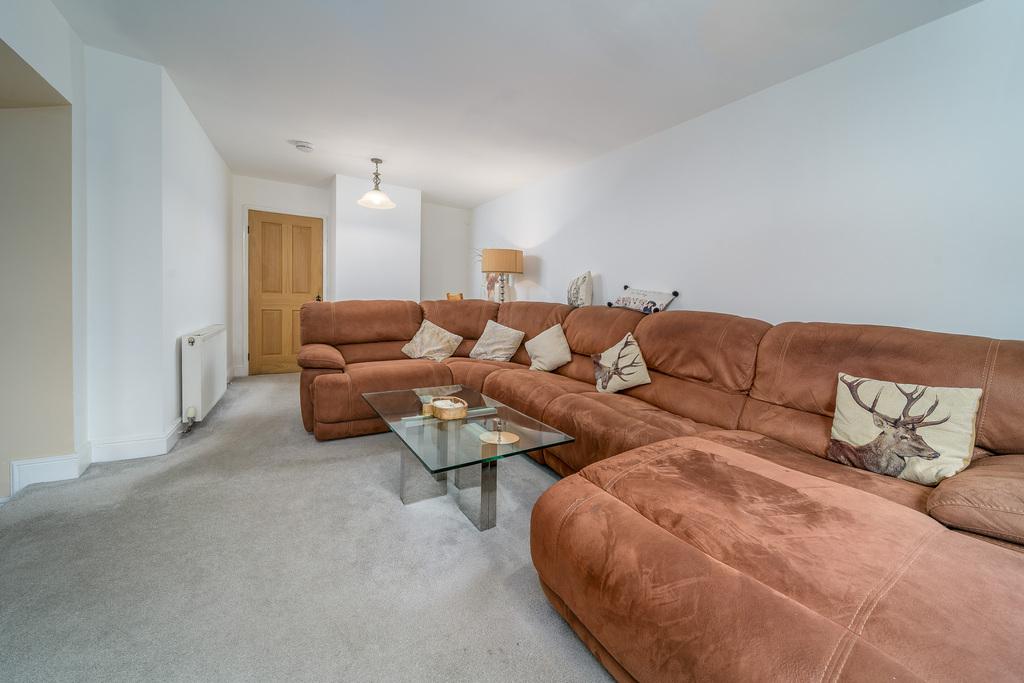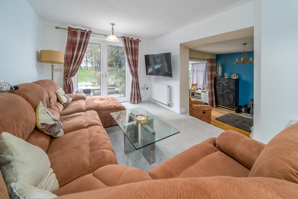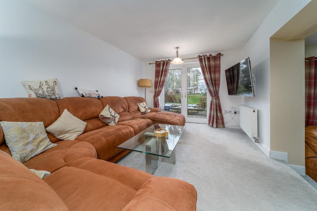 The lounge is an inviting space with French doors opening to the rear garden creating a seamless transition between indoor and outdoor living. There is space for a wall mounted television and a range of comfortable seating. A couple of steps descend to the kitchen-dining-living area which appeals to modern living with space to relax before an exquisite multi-fuel burner, set upon a grey flag stone hearth, which creates a stunning focal point.