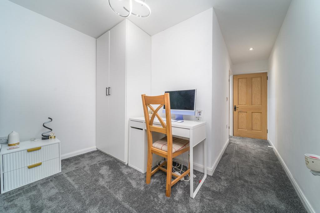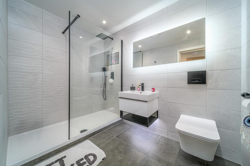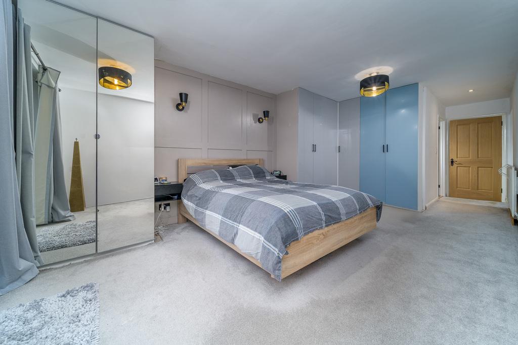 The principal bedroom is a king-sized room with patio doors opening into the rear garden. There are plenty of storage options available in addition to offering space for further bedroom furniture. The en-suite, fully tiled with grey toned tiles, comprises a walk-in shower with a waterfall shower head and a separate shower head within, a wall hung hand wash basin on top of a vanity unit, a concealed cistern toilet with a push button behind, a large illuminated wall-mounted mirror with blue tooth connection, and a black heated towel rail and underfloor heating ensures added comfort.