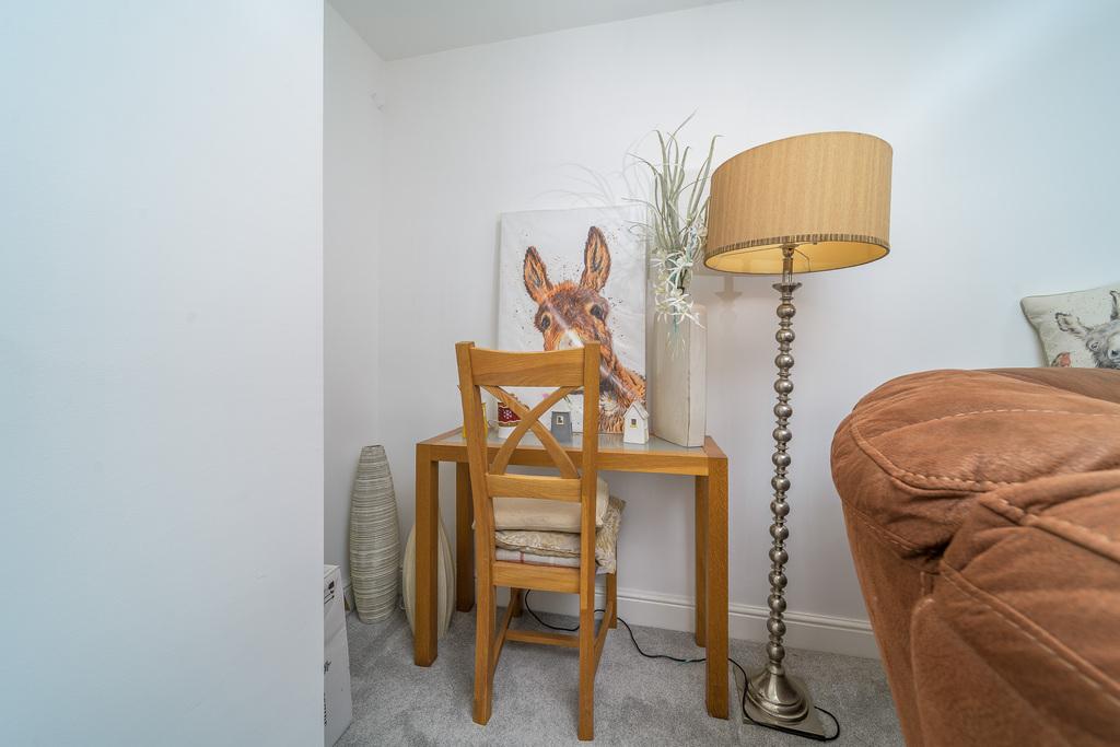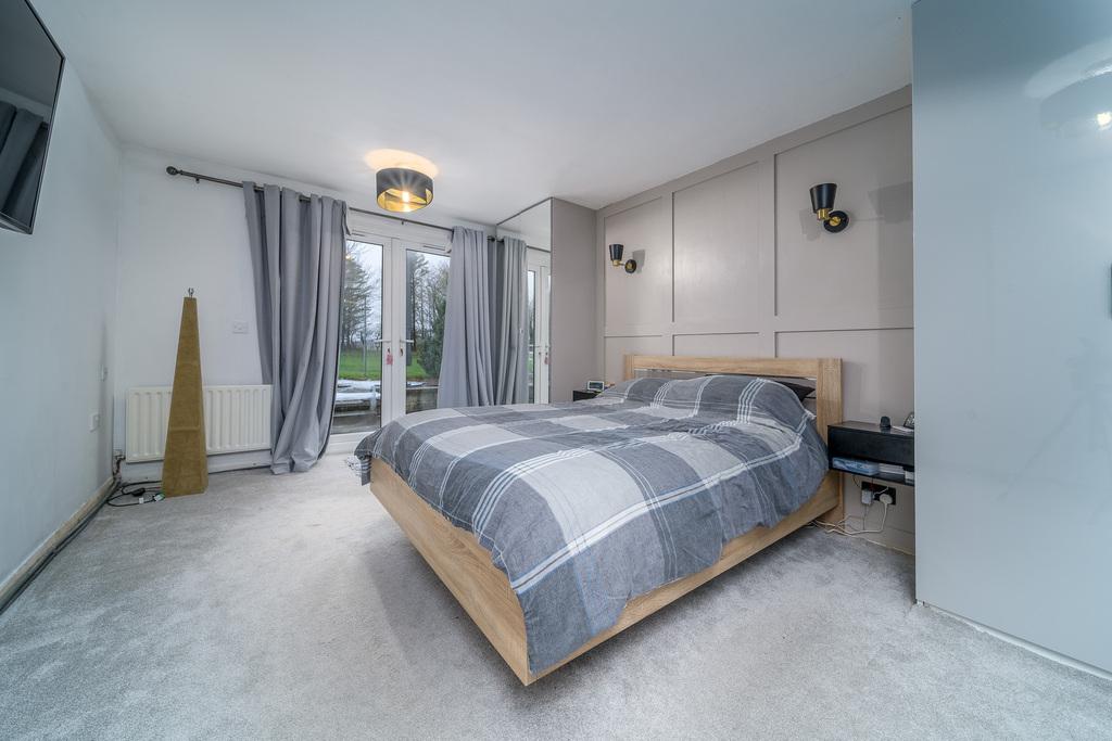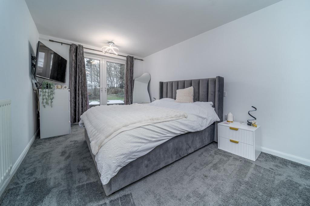 Bedroom 2 is a king-sized room with double doors opening to the rear garden. This light and bright room also offers storage options and space for a range of additional bedroom furniture. The en-suite comprises a shower cubicle with a shower within, a full pedestal hand wash basin and a toilet with a handle flush.