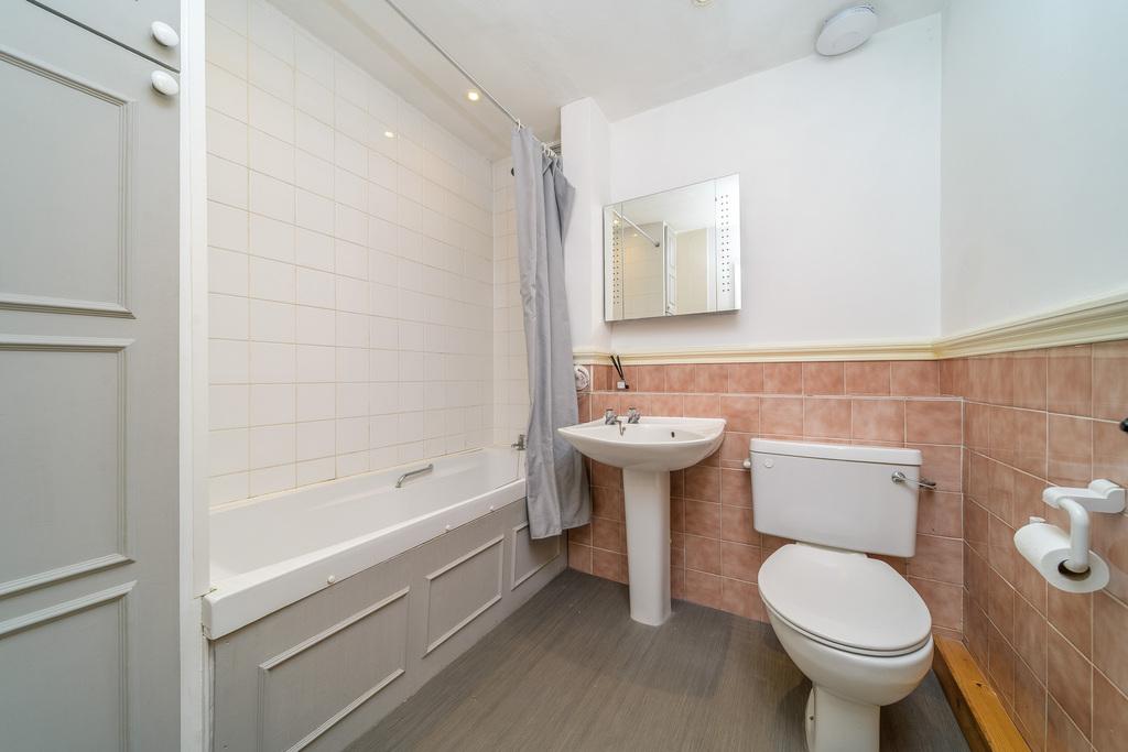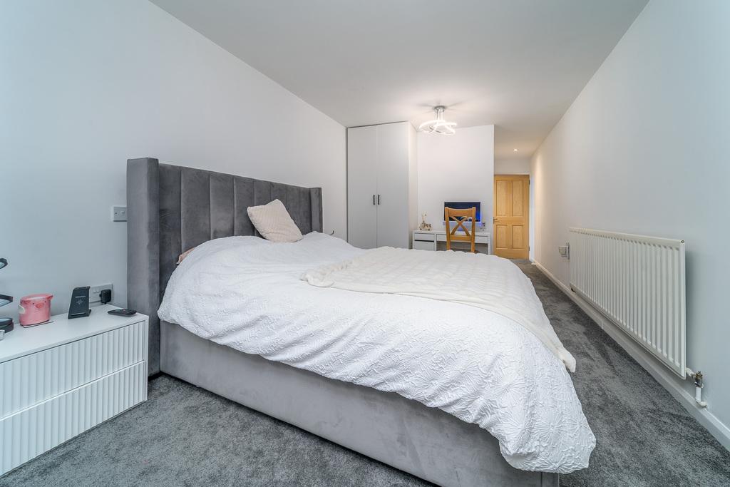 Bedroom 3 is a spacious king-sized room with built in bedside tables and built in wardrobes. This light and airy room also benefits from access to the rear garden. The en-suite comprises a bath with a shower over behind a shower curtain, built-in storage, a full pedestal hand wash basin and a toilet with a handle flush. The space is finished with white tiling creating a crisp and fresh look.