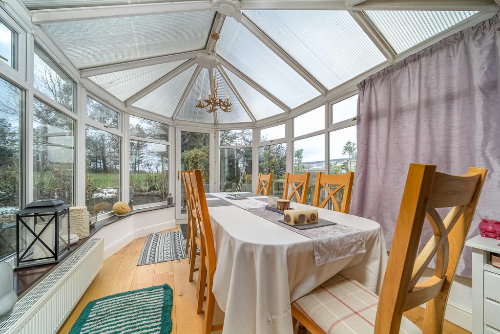 Leading from the kitchen, the conservatory is a superb space easily accommodating a large dining table and accompanying chairs. With a polycarbonate roof and its many windows taking full advantage of the glorious garden and countryside views, this is the ideal space in which to entertain family and friends. A single door provides external access.