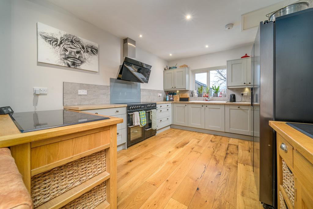 Oozing rustic country cottage style, the kitchen offers a good number of wall and base units with a mushroom/sage coloured shaker-style door complemented by a contrasting wood effect laminate work surface and elongated brick style splash back tiling. There is space for an American-style fridge-freezer and an electric range cooker beneath a NEFF extractor fan, as well as a built-in dishwasher, and a window captures stunning views to the front of the property.