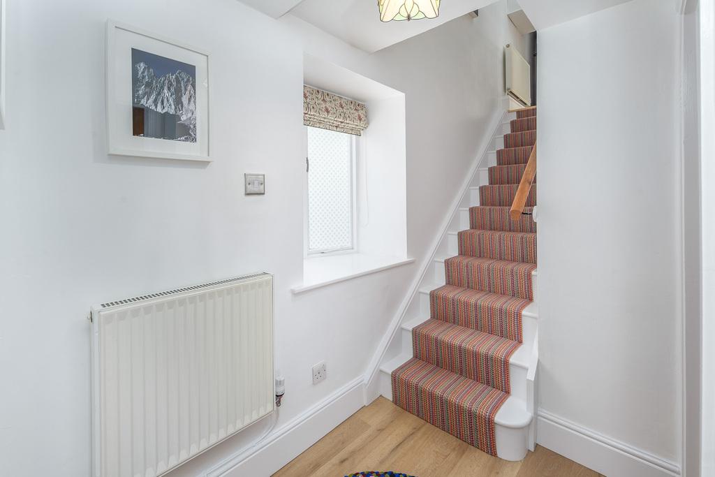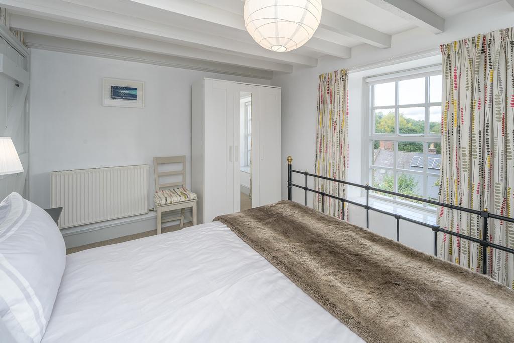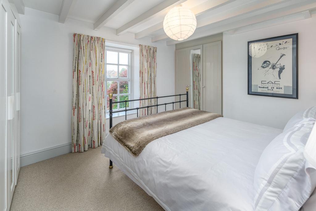 The hallway stairs, with a high-quality Roger Oates pure wool carpet runner, lead down to the lower ground floor bathroom and two bedrooms, both of which have fully fitted carpets. The large main bedroom is light and spacious, with ample room for a King-size bed, and good storage provided by a large, craftsman-built cupboard. The painted wooden ceiling beams add character and charm to this restful and relaxing room.