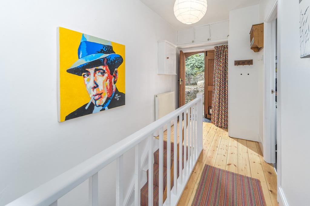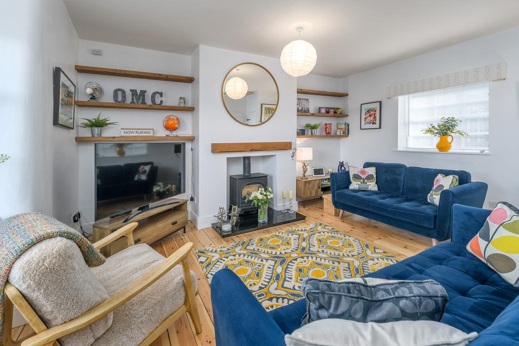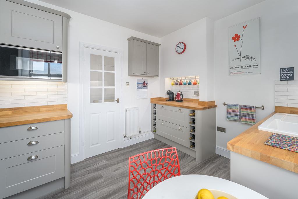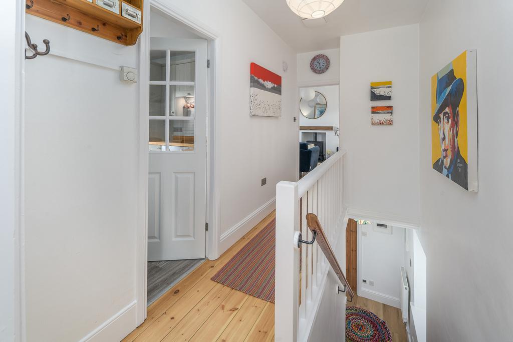Set back from the main road, and accessed by a private drive, where there is parking for two cars, the property is approached by a flagged path and steps, leading to a large, solid wood, double entrance door. This opens onto the hallway leading directly to the kitchen and living room. The hallway and living room benefit from sanded, wooden floors, while the kitchen flooring is hardwearing luxury vinyl, all easily maintained.