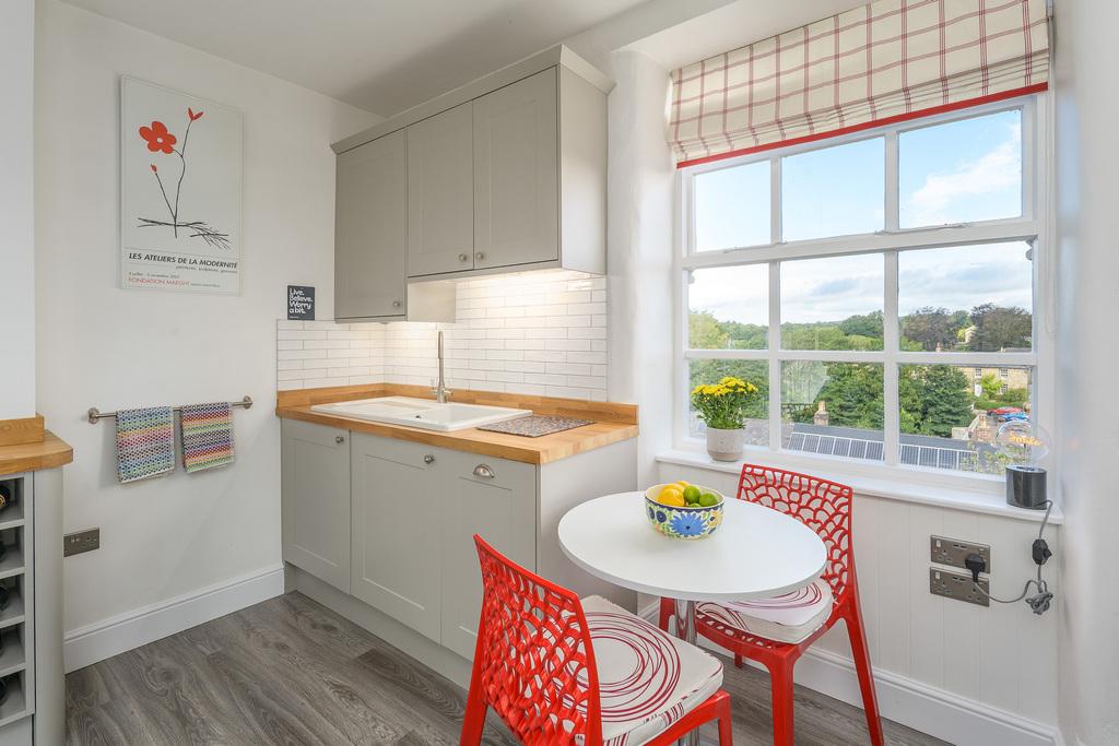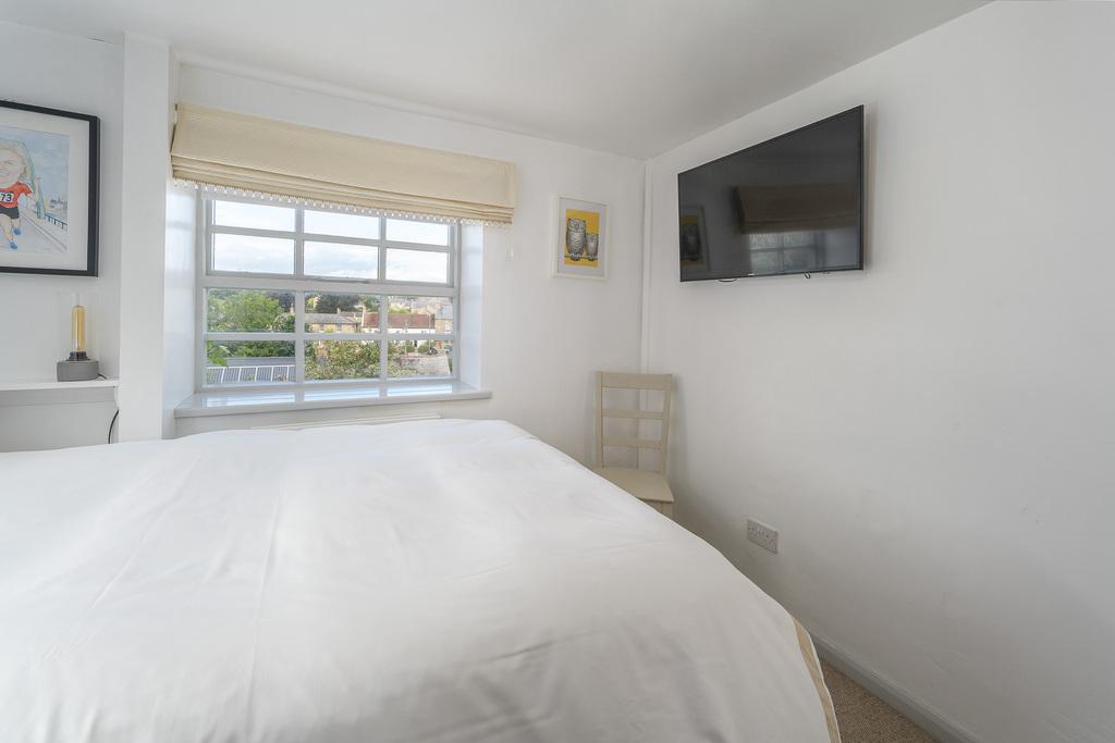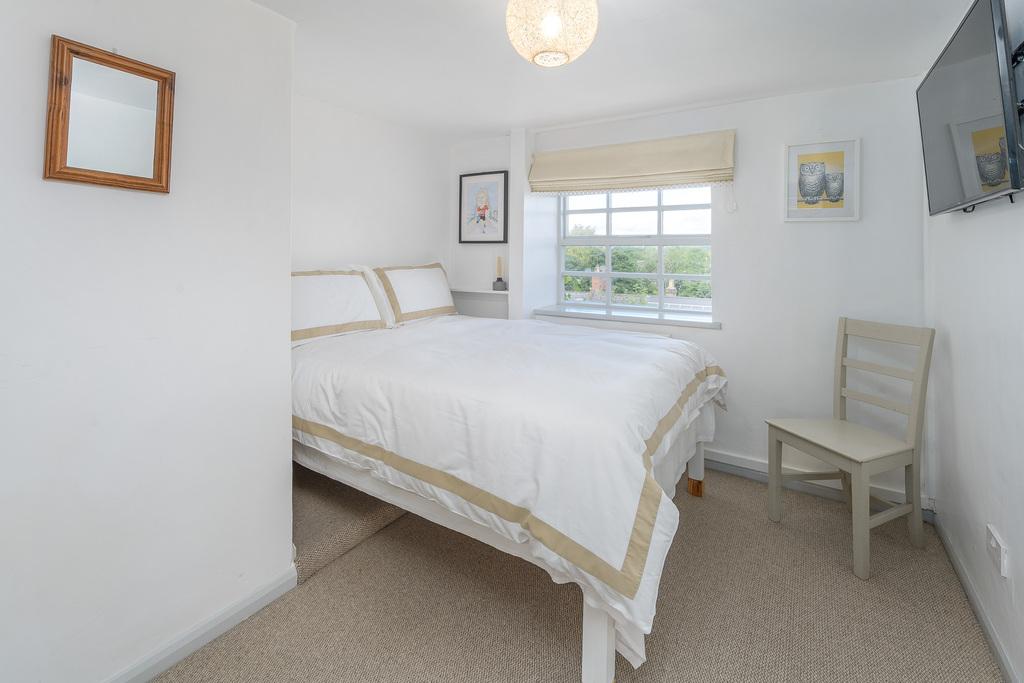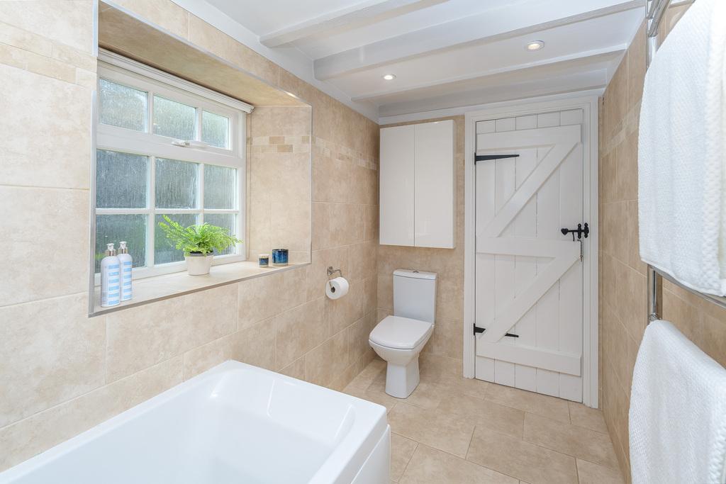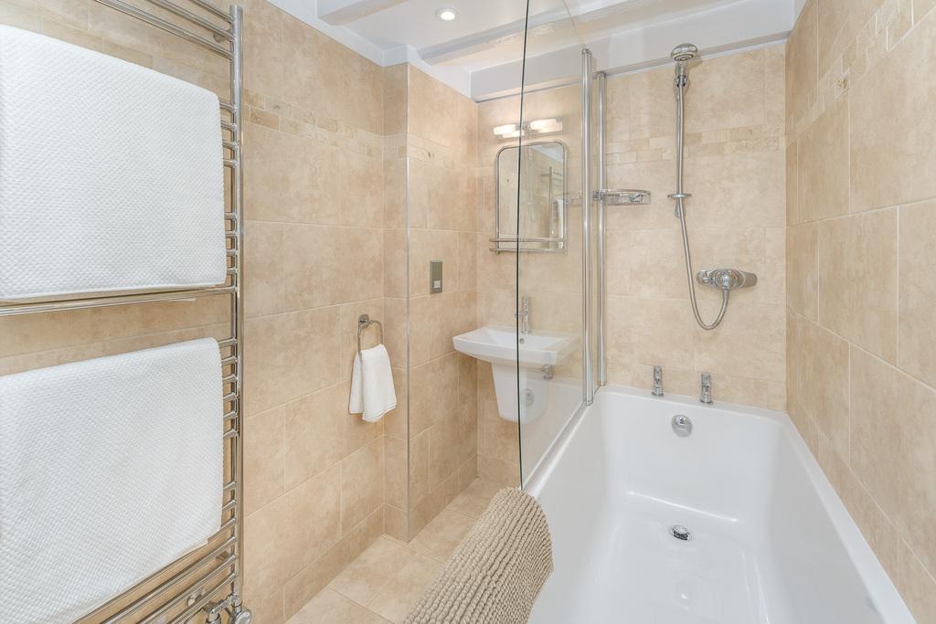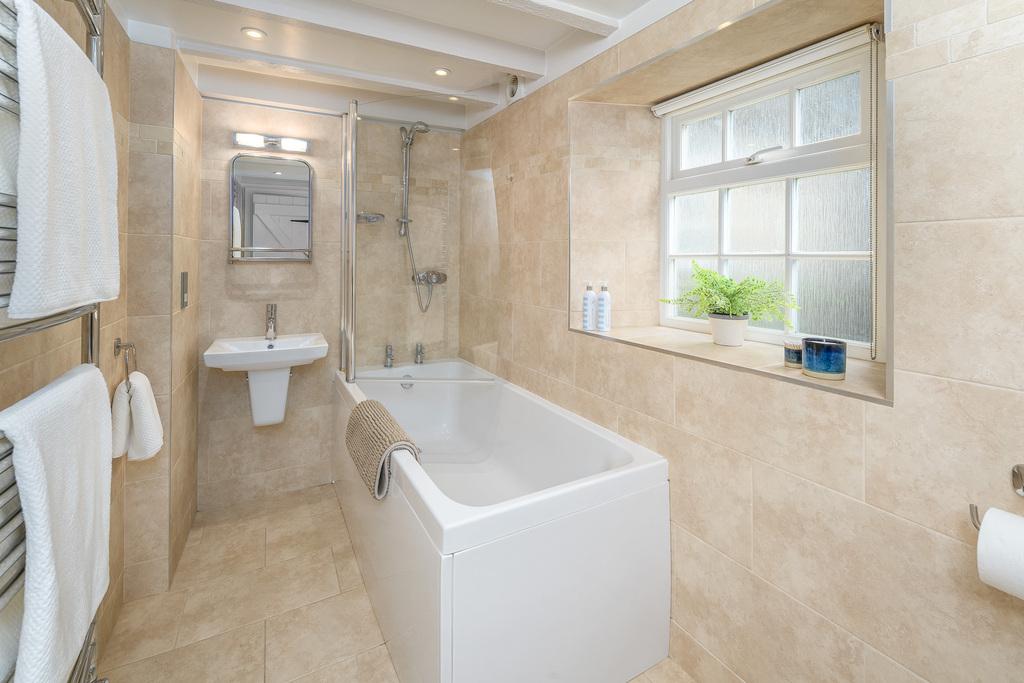 The second bedroom accommodates a Queen-size bed comfortably, with good storage provided by a large built-in cupboard. This room also contains a wall-mounted TV. Both west-facing bedrooms also enjoy lovely village views. The family bathroom comprises a large bath with a Mira Sport shower, a close-coupled toilet with a wall-hung wash basin, and a large heated towel rail. There is both natural light and dimmable spotlights which are set into the beamed ceiling. The bathroom is finished with easily maintained sandstone-coloured tiling throughout, creating a simple and stylish look.