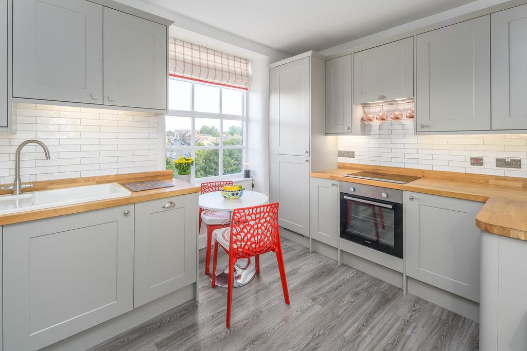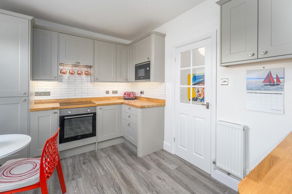 Welcoming and inviting, the living room provides ample space for both dining and relaxation in this large and light area, with its high ceiling, large windows and polished wooden floor, adding to the spacious feel. A focal point is the simple yet stylish fireplace with its oak beam mantelpiece and gas-fired, ‘wood burning’ style stove. The alcoves contain high-quality, solid wood floating shelves, providing both storage and display opportunities. The living room also benefits from a built-in cupboard and ladder access to the fully boarded loft area which provides extensive storage space.