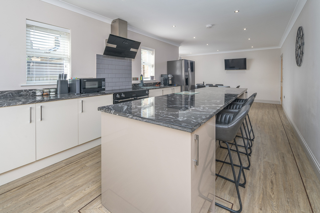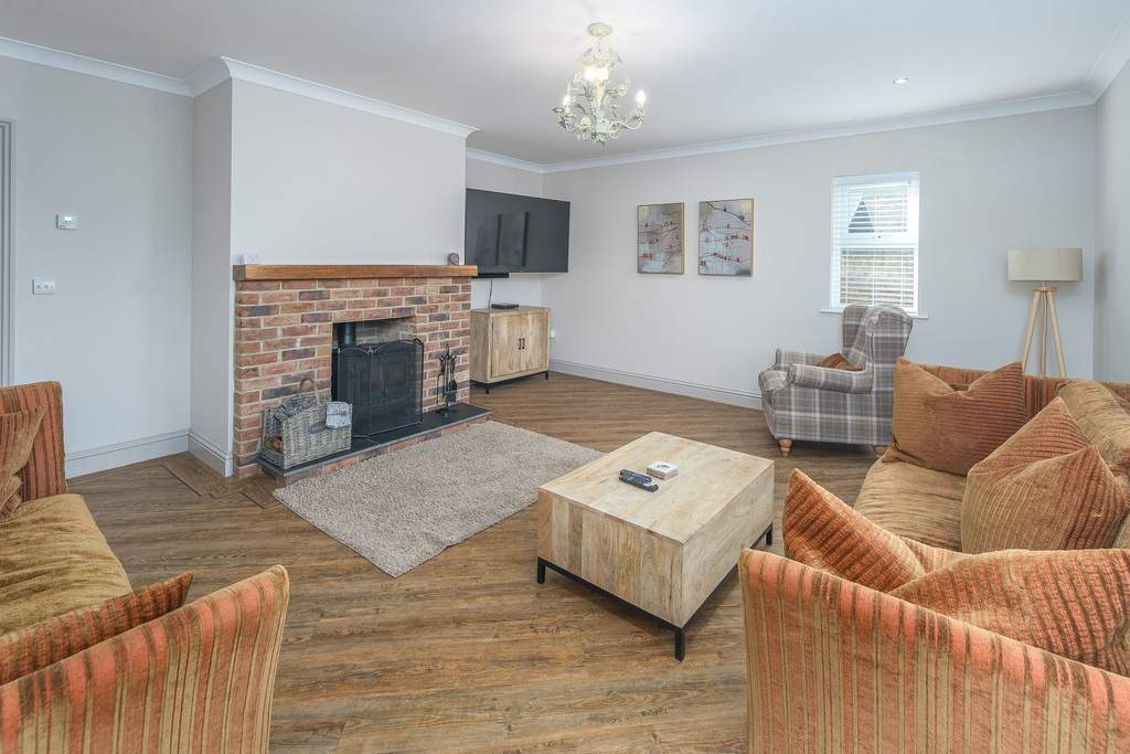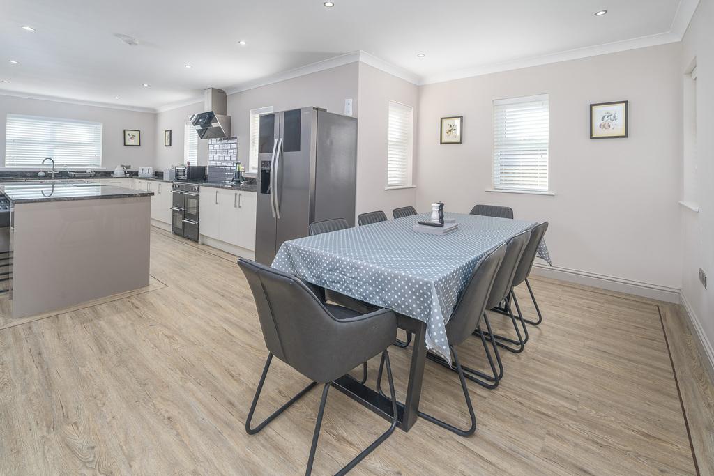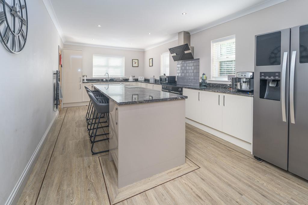 Bathed in natural light, the spacious lounge with windows to three sides is an inviting space in which to spend time with family and friends. There is a glorious Stoves woodburner set within a brick fireplace with a black stone hearth and wood mantle enticing you to sit before it during the cooler months and the space is finished stylishly with Karndean flooring and the addition of coving and a pendant light fitting add elegance. The room continues round to the dining-kitchen area, the dining space comfortably accommodating a large dining table and accompanying chairs. Within its many windows, the impressively large kitchen is beautifully light and bright and offers a good number of base units with a high gloss mushroom-coloured door complemented by a dark granite effect work surface with a matching upstand and a grey brick style splash back. There is space for a large range cooker with an induction hob on top beneath a black glass extractor fan and a stainless-steel splash back behind and space for an American style fridge freezer. In terms of fitted equipment, there is a full-sized dishwasher, a large pantry cupboard and a bowl and a half acrylic sink dropped into the work surface with a drainer cut in at the side. Furthermore, there is a central island with additional seating and storage.