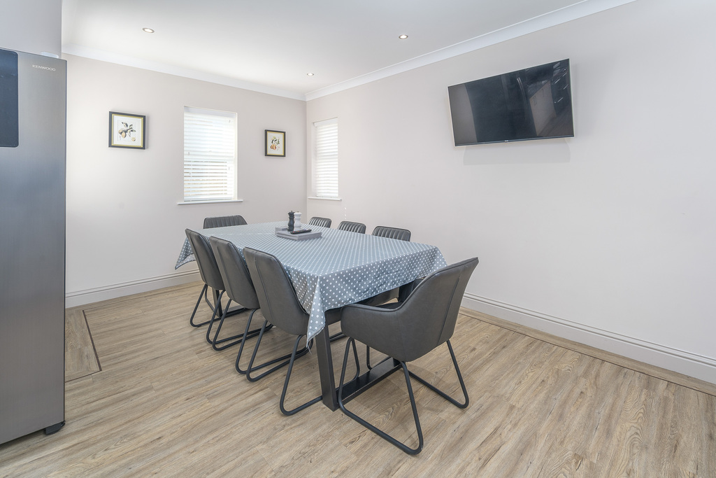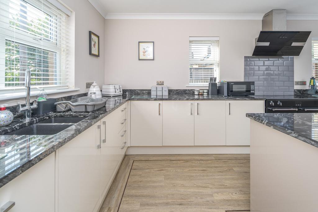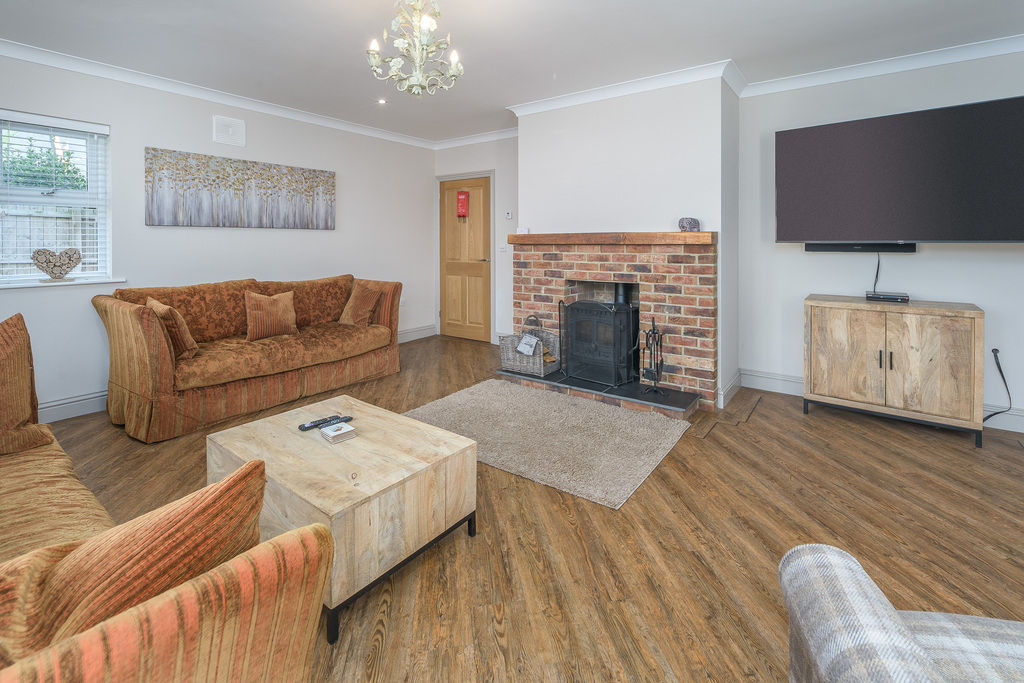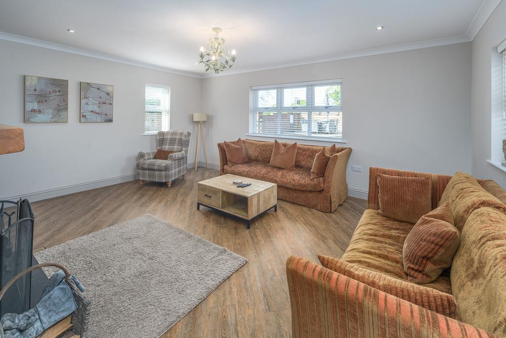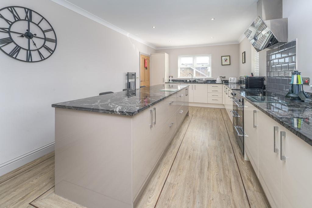 Bathed in natural light, the spacious lounge with windows to three sides is an inviting space in which to spend time with family and friends. There is a glorious Stoves woodburner set within a brick fireplace with a black stone hearth and wood mantle enticing you to sit before it during the cooler months and the space is finished stylishly with Karndean flooring and the addition of coving and a pendant light fitting add elegance. The room continues round to the dining-kitchen area, the dining space comfortably accommodating a large dining table and accompanying chairs. Within its many windows, the impressively large kitchen is beautifully light and bright and offers a good number of base units with a high gloss mushroom-coloured door complemented by a dark granite effect work surface with a matching upstand and a grey brick style splash back. There is space for a large range cooker with an induction hob on top beneath a black glass extractor fan and a stainless-steel splash back behind and space for an American style fridge freezer. In terms of fitted equipment, there is a full-sized dishwasher, a large pantry cupboard and a bowl and a half acrylic sink dropped into the work surface with a drainer cut in at the side. Furthermore, there is a central island with additional seating and storage.