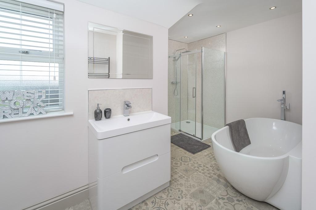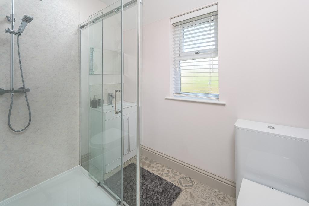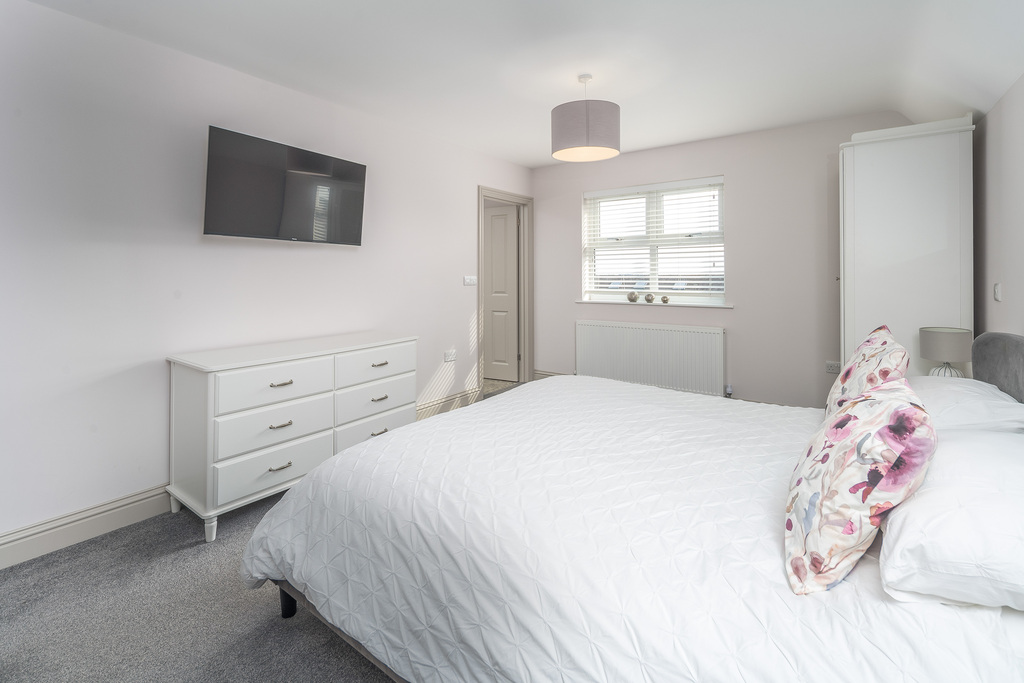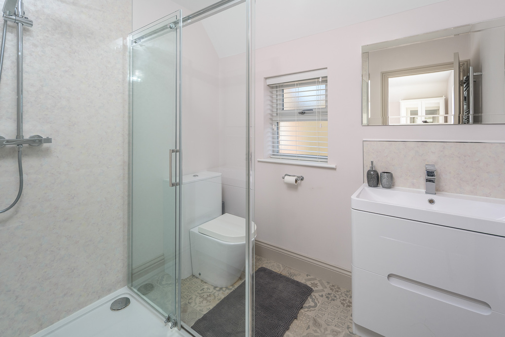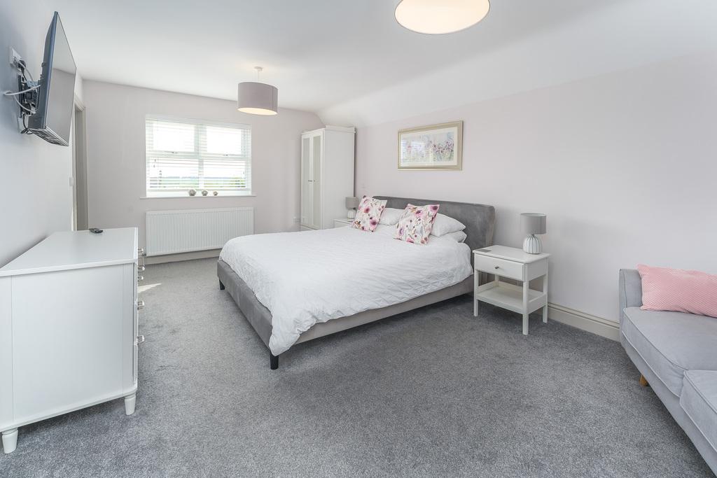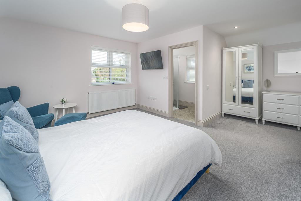 Bedroom 2 is a super king-sized bedroom which offers plenty of space for additional bedroom furniture. This room takes advantage of views to the rear of the property. The en-suite comprises a good-sized shower cubicle with wet walling and a water fall shower head and separate shower head within, a vanity unit with a large hand wash basin on top, a concealed cistern toilet within a unit with a push button behind. A radiator ensures added comfort and natural light enters via a window with privacy glass.