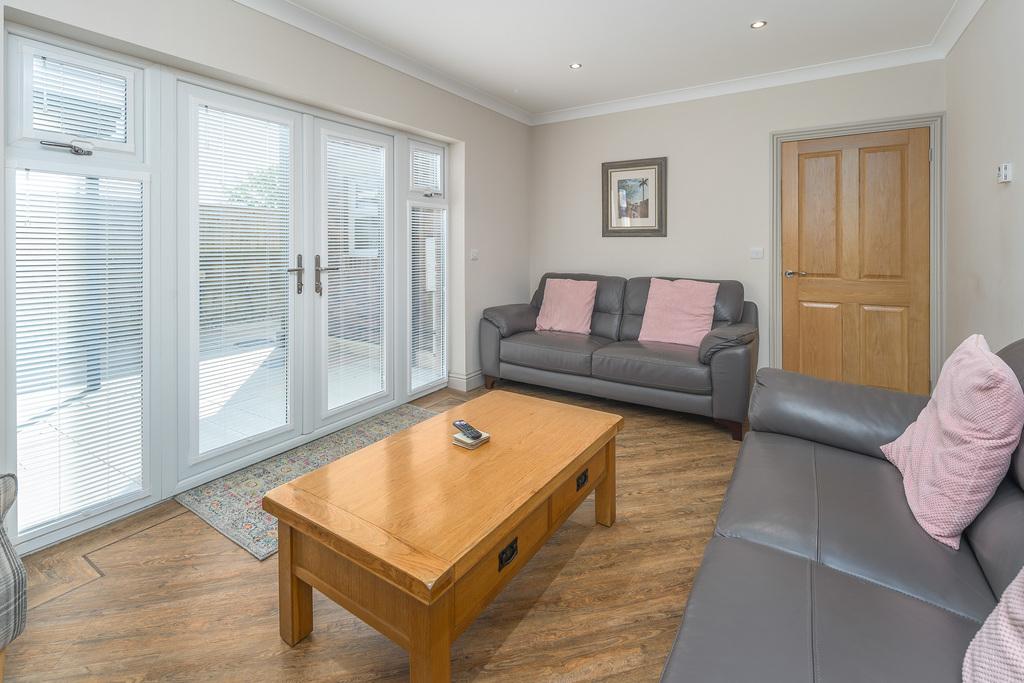 A second reception room offers further living space and features French doors, with internal blinds, which open out to a patio at the rear of the property.