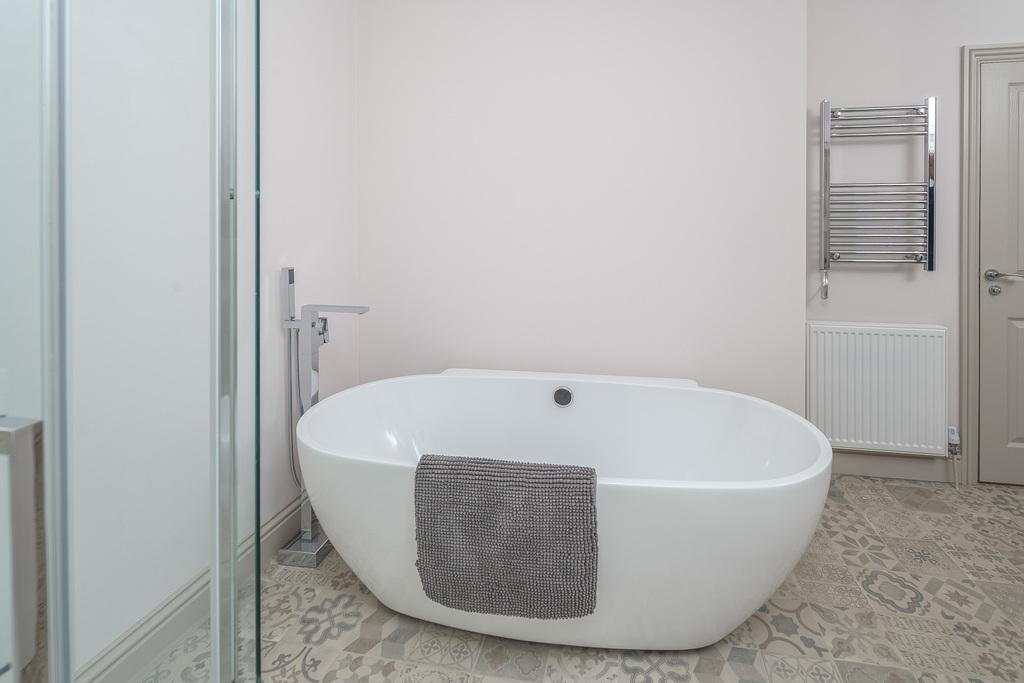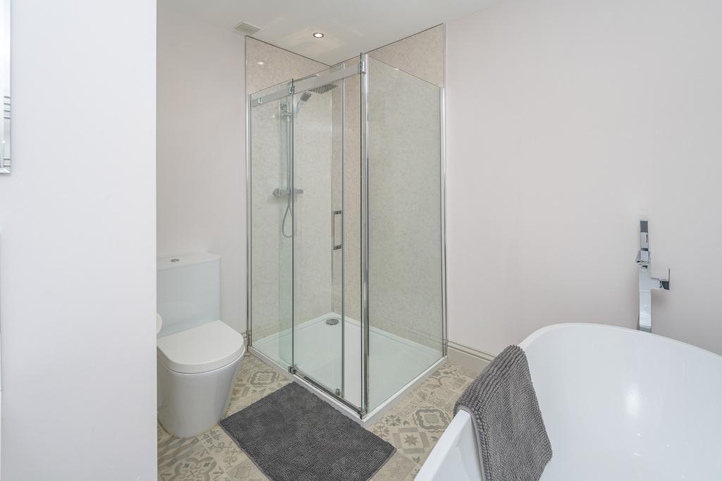 The spacious family bathroom comprises an impressive free-standing bath with a taps over and a shower head above, a double sized shower cubicle with wet walling and a waterfall shower head and a separate shower head within, a concealed cistern toilet with a push button behind and a vanity unit with a hand wash basin on top. A chrome heated towel rail and a radiator complete this beautiful room where you can relax and enjoy the bathing experience. Two windows allow for plenty of natural light.