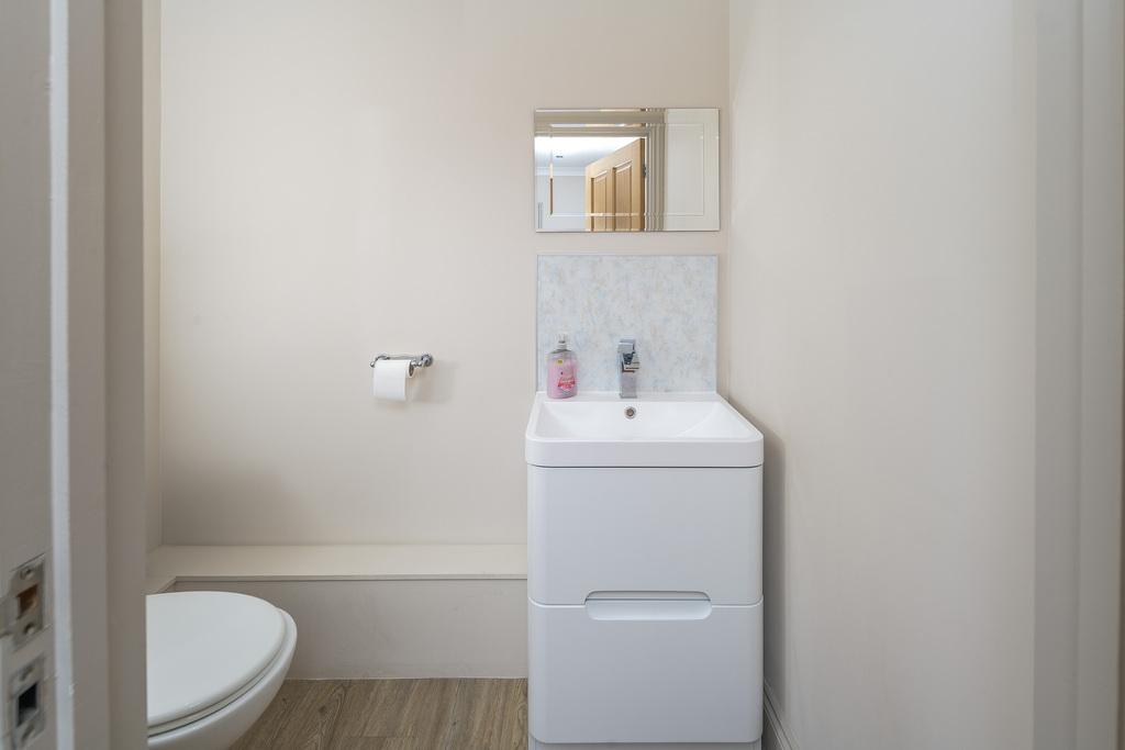 Leading from the utility room is a plant room which houses the boiler, the immersion heater and the manifold for the ground floor underfloor heating. Adjacent is the visitor’s WC which is a superb asset as it negates the need to continually frequent the upstairs facilities. The suite comprises a unit with a concealed cistern toilet with a push button behind and a vanity unit with a sink on top with a wet wall splash back and a mirror above. A chrome heated towel rail ensures added comfort, and the space is practically finished with Karndean flooring.